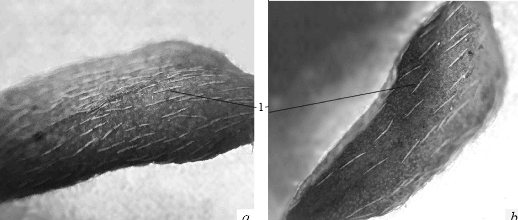 Рисунок 1. Опушение листа астрагала Цингера: a – фрагмент нижней стороны листа; b – фрагмент верхней стороны листа. Обозначения: 1 – Т-образные волоски.