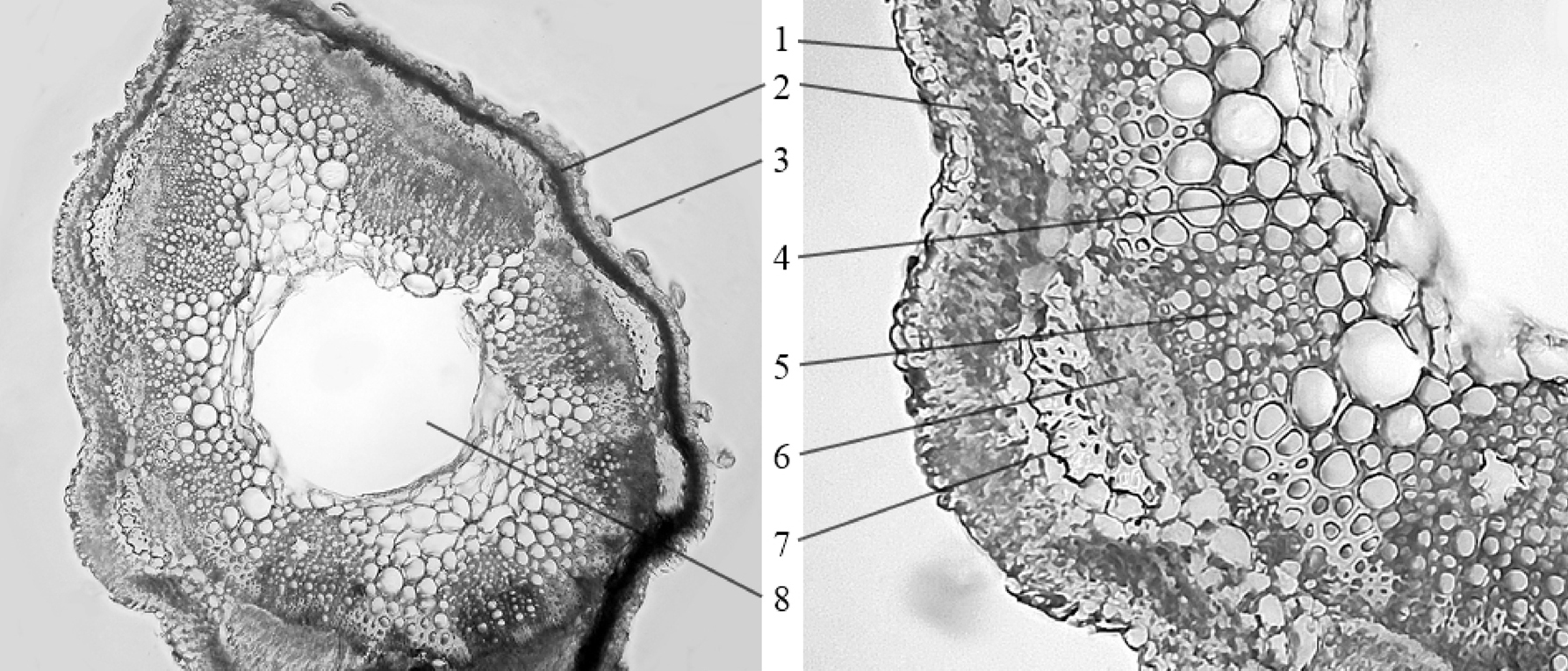 Рисунок 2. Поперечный срез стебля аcтрагала Цингера: а – общий план строения стебля (10х10); b – проводящий пучок (10х40). Обозначения: 1 – эпидермис, 2 – первичная кора, 3 – Т-образный волосок, 4 – основная паренхима, 5 – ксилема, 6 – флоэма, 7 – колленхима, 8 – полость в центре стебля.