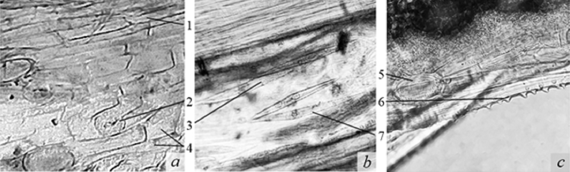 Figure 3. Fragment of leaf epidermis of Astragalus zingeri: а – above the rib (top), between the ribs (bottom) (10х40); b – trichomes of the stem (10х10); с – trichome with cuticle outgrowths (10х40). De-signations: 1 – elongated epidermal cells above the rib, 2 – stomata, 3 – equal-armed Т-shaped trichome, 4 – epidermal cells between the ribs of various shapes, 5 – base of the trichome, 6 – cuticle outgrowths, 7 – slightly unequal-armed T-shaped trichome.