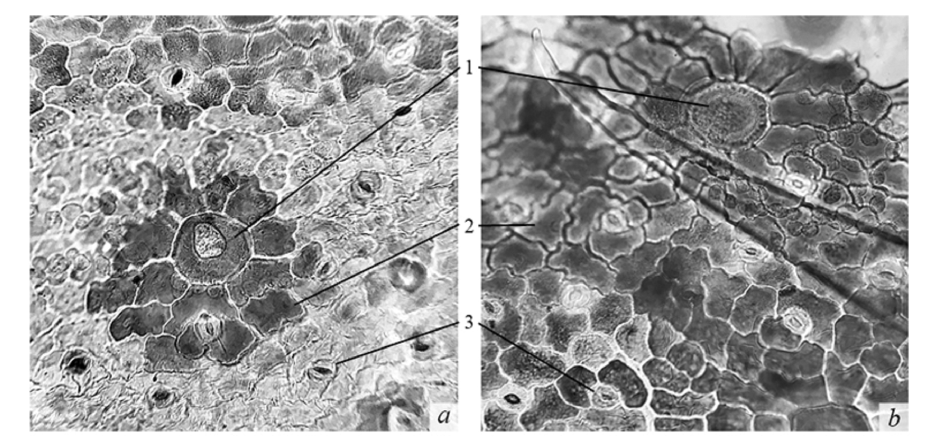 Figure 4. Fragment of leaf epidermis of Astragalus zingeri: (10x40): а – fragment of lower epidermis; b – fragment of upper epidermis. Designations: 1 – the place of attachment of the trichome, 2 – highly sinuous-walled epidermal cells, 3 – stomata.