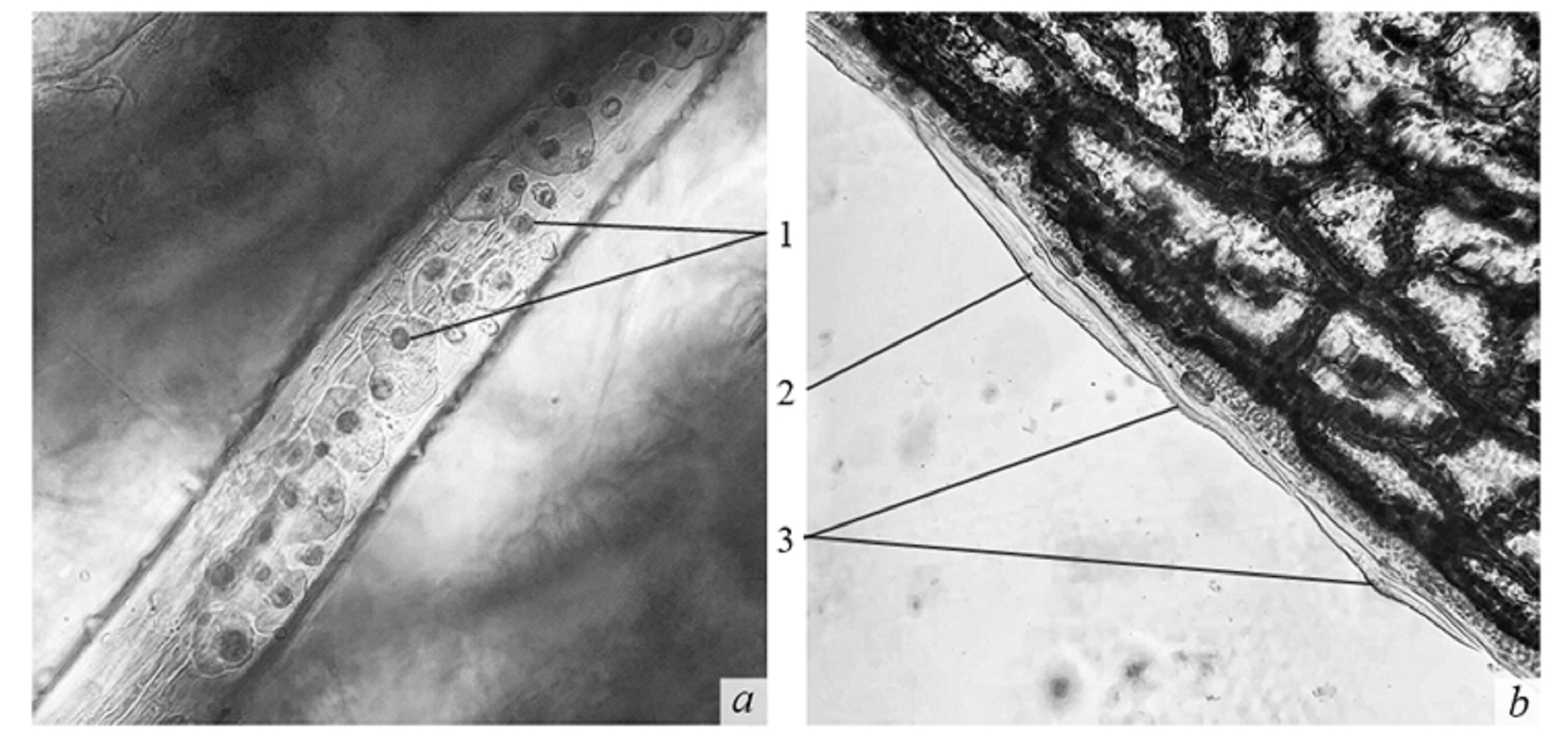Рисунок 5. Фрагмент нижнего эпидермиса листа аcтрагала Цингера: a – выросты кутикулы волоска (10х40); b – Т-образные волоски по краю листовой пластинки (10х10). Обозначения: 1 – выросты кутикулы волоска, 2 – слабонеравноплечий Т-образный волосок, 3 – равноплечие Т-образные волоски.