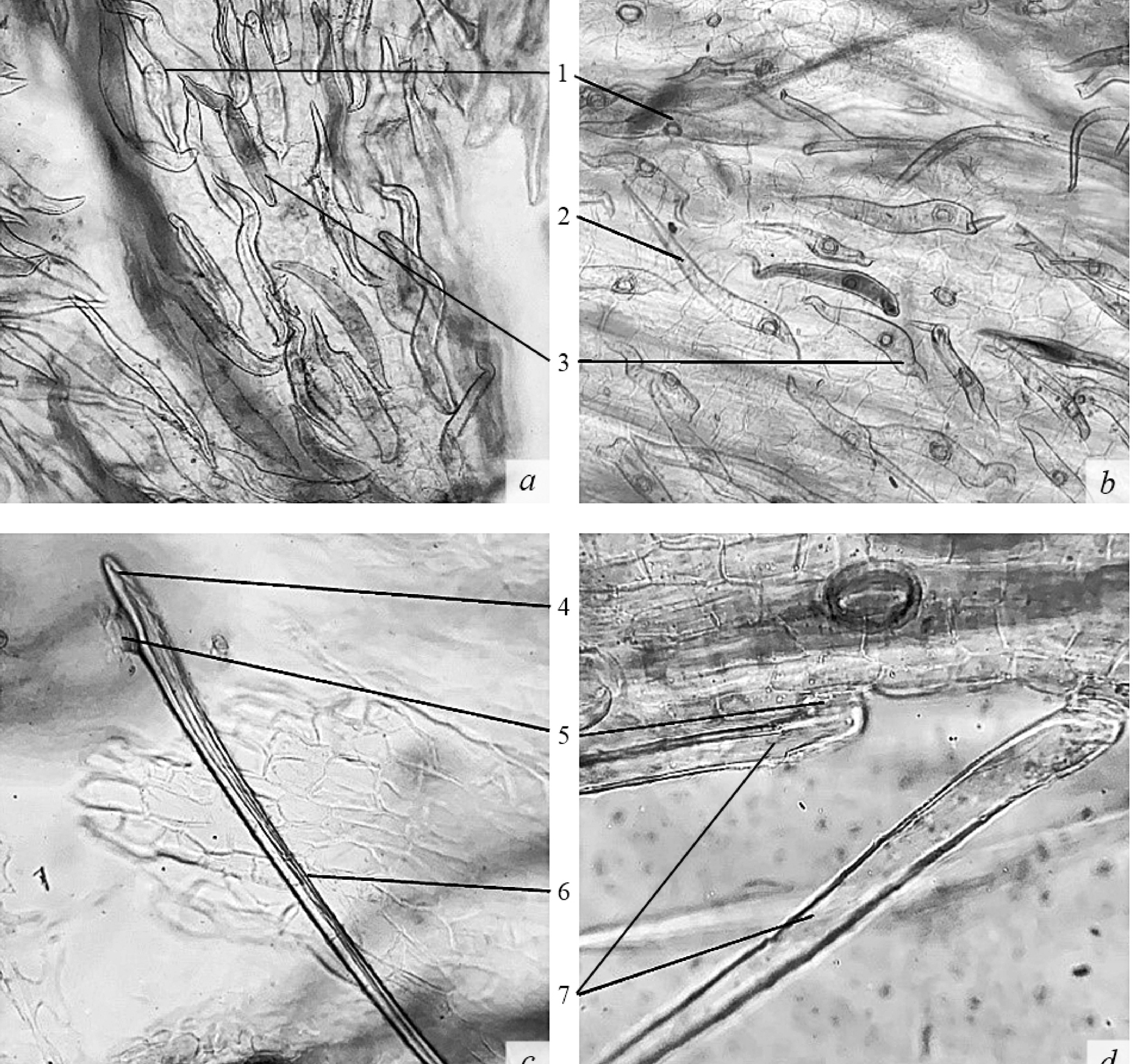 Figure 6. Calyx epidermis of Astragalus zingeri: а – on the bottom (10х10); b – in the middle (10х10); с – on the top (10х40); d – T-shaped trichome on a calyx barb (10х40). Designations: 1 – equal-armed Т-shaped trichomes, 2 – strongly unequal-armed T-shaped trichomes, 3 – slightly unequal-armed T-shaped trichomes, 4 – T-shaped trichome with almost reduced shoulder, 5 – base of the trichome, 6 – long arm of trichome, 7 – one-armed trichomes.