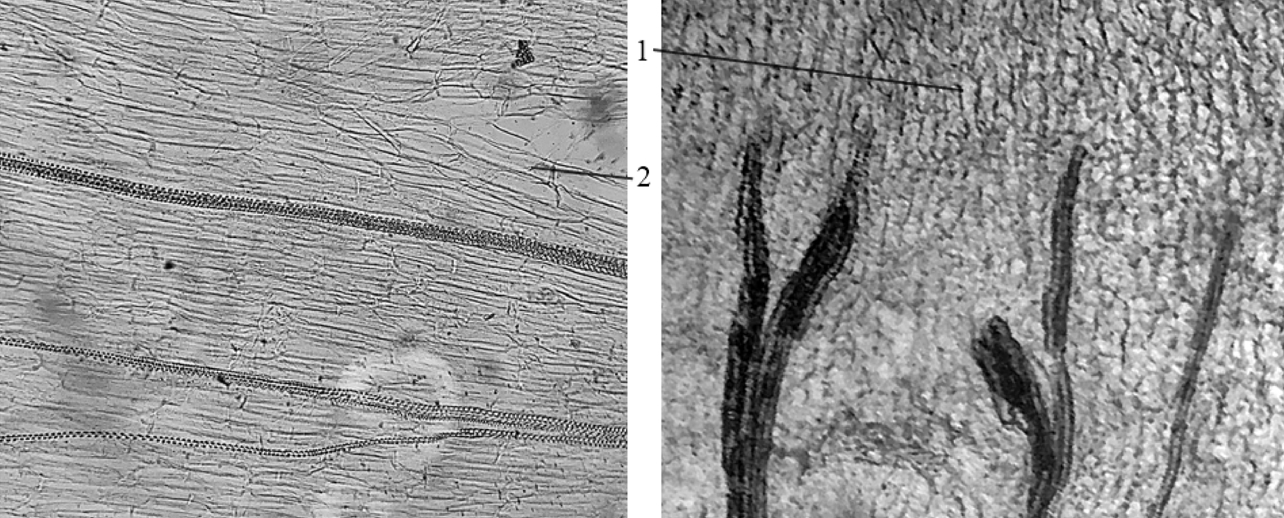 Приготовление микропрепаратов, микроскопию и их анализ проводили по общепринятой фармакопейной методике – ГФ XIV ОФС.1.5.3.0003.15 «Техника микроскопического и микрохимического исследования лекарственного растительного сырья и лекарственных растительных препаратов» [12]. Приготовленные микропрепараты рассматривали с помощью микроскопа марки ZEISS Plan-Apochromat (Германия) с увеличениями 10×4, 10×10, 10×40, 10×100. Фотографировали с помощью цифровой камеры Levenhuk M1400 PLUS. Полученные микрофотографии редактировали в программе Photoscape 3.7.