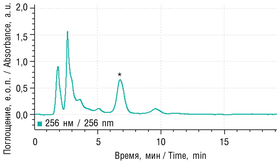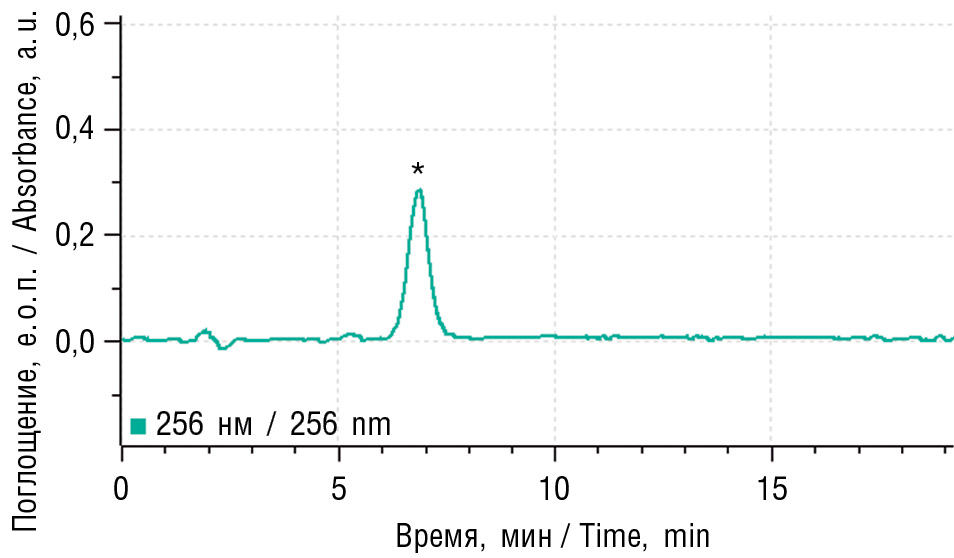 Рис. 3. Высокоэффективная жидкостная хроматограмма стандартного раствора глицирама: * — глицирам / Fig. 3. High performance liquid chromatogram of glycyram standard solution: * — glycyram