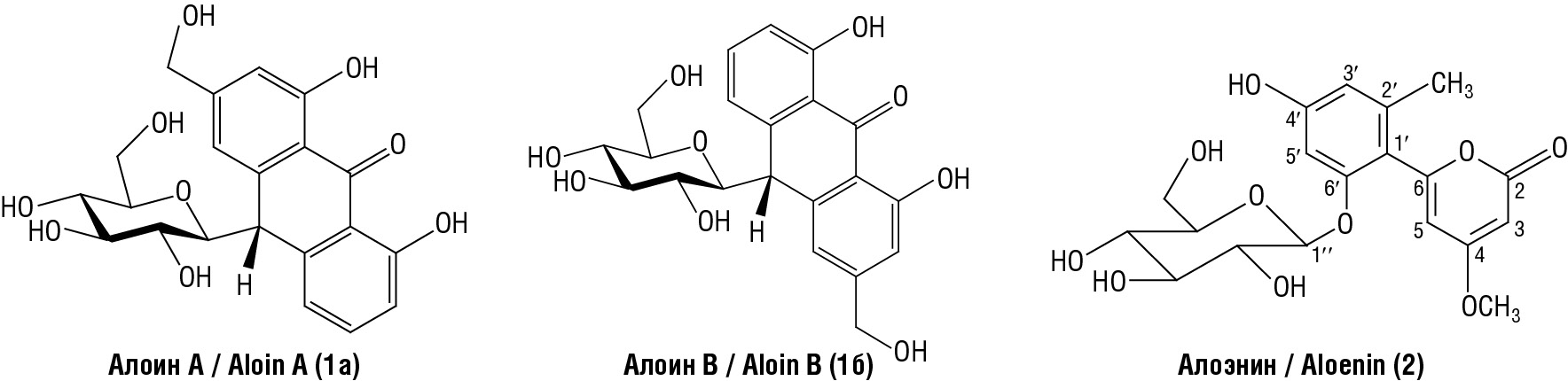 Ведущей группой биологически активных соединений листьев алоэ древовидного являются антраценпроизводные, среди которых доминирует барбалоин, или алоин (смесь диастереоизомеров, обозначаемых как алоины А и В) (рис. 1) [12, 13, 15]. Содержание алоинов в разных видах алоэ может составлять от 0,1 до 10 % и более в пересчете на абсолютно сухое сырье [18, 19]. В организме человека алоины метаболизируются в более активное соединение — алоэ-эмодин-9-антрон, который, как было установлено в исследованиях биологической активности, обусловливает слабительный эффект препаратов алоэ [4]. Помимо слабительного действия для барбалоина продемонстрировано противогистаминное, противовоспалительное, противовирусное, антимикробное, противоопухолевое действие [18].