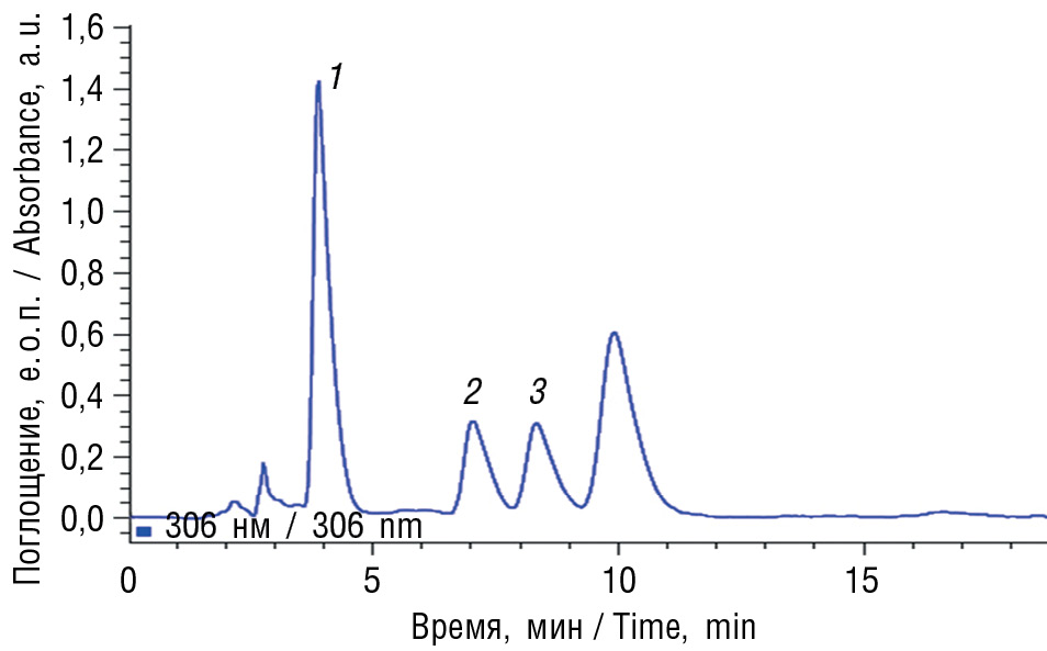 Рис. 2. Высокоэффективная жидкостная хроматограмма сока листьев алоэ древовидного: 1 — алоэнин; 2, 3 — алоины А и В / Fig. 2. HPLC chromatogram of juice from Aloe arborescens leaves: 1 — aloenin; 2, 3 — aloins A and B