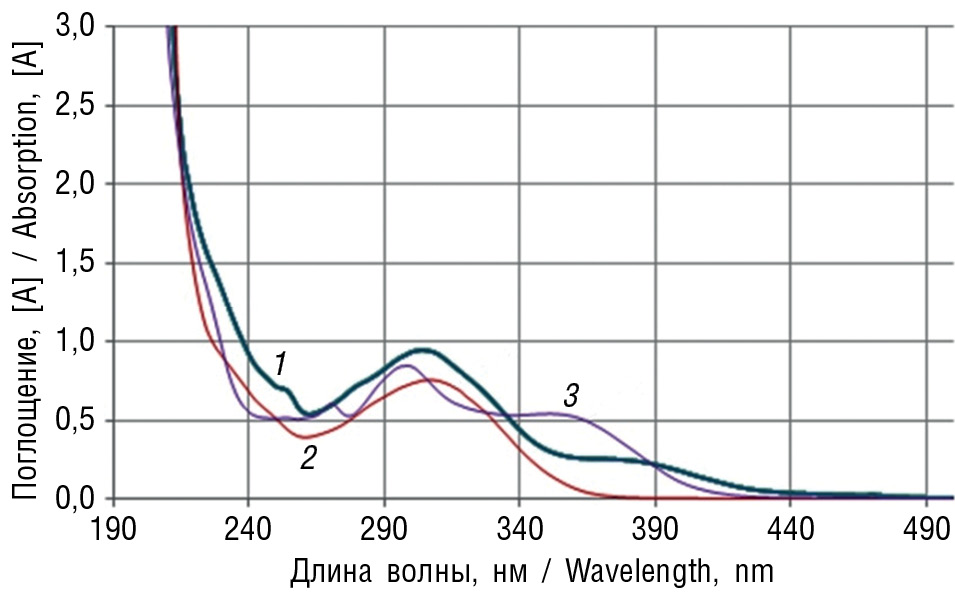 Рис. 3. Электронные спектры водно-спиртового извлечения из свежих листьев алоэ древовидного и выделенных из листьев алоэ соединений: 1 — водно-спиртовое извлечение из свежих листьев алоэ древовидного; 2 — 0,003 % раствор барбалоина; 3 — 0,003 % раствор алоэнина / Fig. 3. Electronic spectra of aqueous-alcoholic extract from Aloe arborescens fresh leaves and compounds isolated from aloe leaves: 1 — water-alcohol extract from Aloe arborescens fresh leaves; 2 — barbaloin solution, 0.003%; 3 — aloenin solution, 0.003%