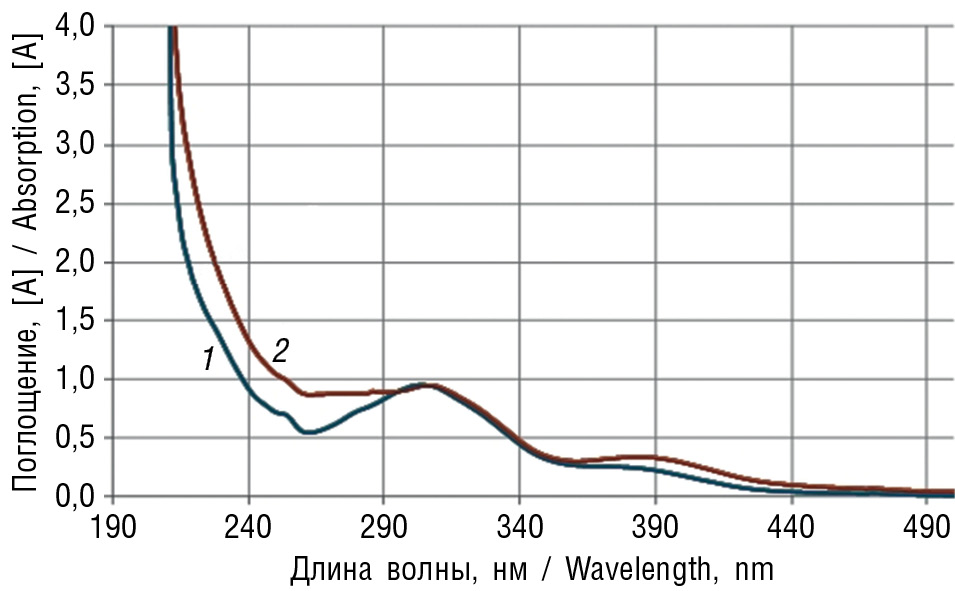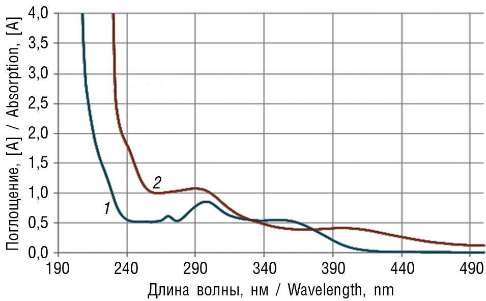 Рис. 4. Электронные спектры водно-спиртового извлечения из свежих листьев алоэ древовидного: 1 — водно-спиртовое извлечение из свежих листьев алоэ древовидного; 2 — водно-спиртовое извлечение в щелочно-аммиачной среде / Fig. 4. Electronic spectra of aqueous-alcoholic extract from Aloe arborescens fresh leaves: 1 — water-alcohol extract from Aloe arborescens fresh leaves; 2 — water-alcohol extract in the alkaline-ammonia solution