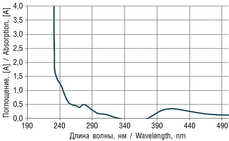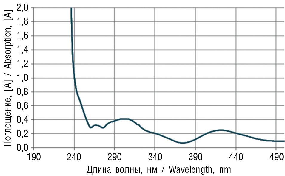 Рис. 5. Электронный спектр водно-спиртового извлечения из свежих листьев алоэ древовидного (дифференциальный вариант) / Fig. 5. Electronic spectra of aqueous-alcoholic extract from Aloe arborescens fresh leaves (differential version)