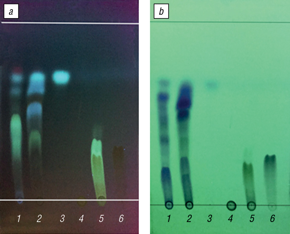 Рис. 3. Хроматограмма анализа спиртовых извлечений из почек некоторых видов тополя в системе растворителей хлороформ/этанол (9 : 1): a — детекция в УФ-свете при длине волны 366 нм; b — детекция в УФ-свете при длине волны 254 нм. Образцы извлечений на 96 % этиловом спирте: 1 — почки тополя черного; 2 — почки тополя краснонервного; 3 — пиностробин;. 4 — рутин; 5 — кверцетин; 6 — лютеолин / Fig. 3. Chromatogram of the analysis of the alcohol extraction from Populus buds in the system of solvents chloroform/ethanol (9:1): a — detection in UV-light at the wavelength of 366 nm; b — detection in UV-light at the wavelength of 254 nm. Samples of extractions on 96% ethyl alcohol: 1 — buds of Populus nigra; 2 — buds of Populus rubrinervis; 3 — pinostrobin; 4 — rutin; 5 — quercetin; 6 — luteolin