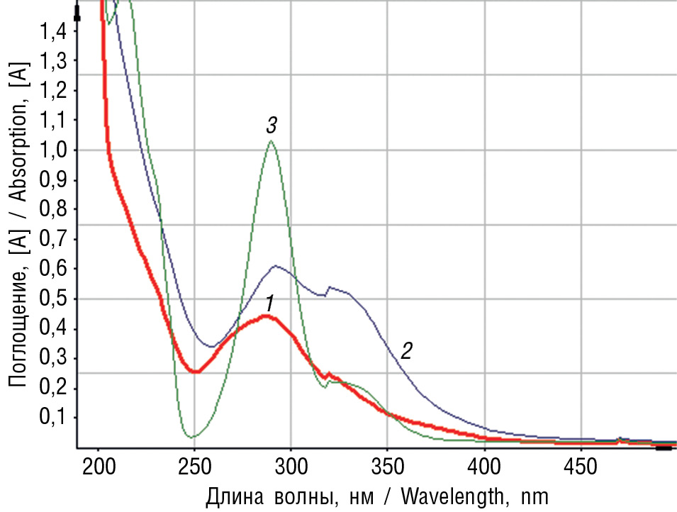 Рис. 4. Электронные спектры спиртовых извлечений из почек некоторых видов тополя: 1 — извлечение из почек тополя краснонервного; 2 — извлечение из почек тополя черного; 3 — раствор стандартного образца пиностробина / Fig. 4. Electronic spectra of alcohol extractions from Populus buds: 1 — extraction from the buds of Populus rubrinervis; 2 — extraction from the buds of Populus nigra; 3 — solution of a reference standard of pinostrobin