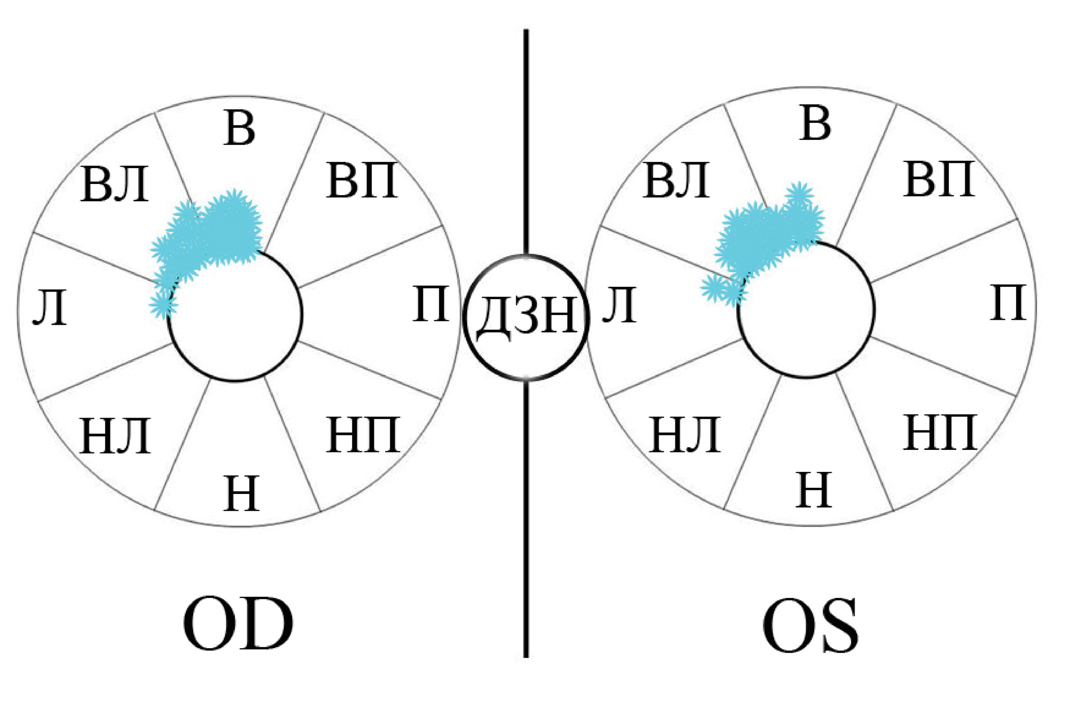 Figure 1. Schematic distribution of the preferred retinal locus for 49 right (OD) and 45 left (OS) eyes of 90 patients. The retina around scotoma is conditionally divided into sectors: B – upper, ВП – upper-right, П – right, НП – lower-right, Н – lower, НЛ – lower-left, Л – left, ВЛ – upper-left.