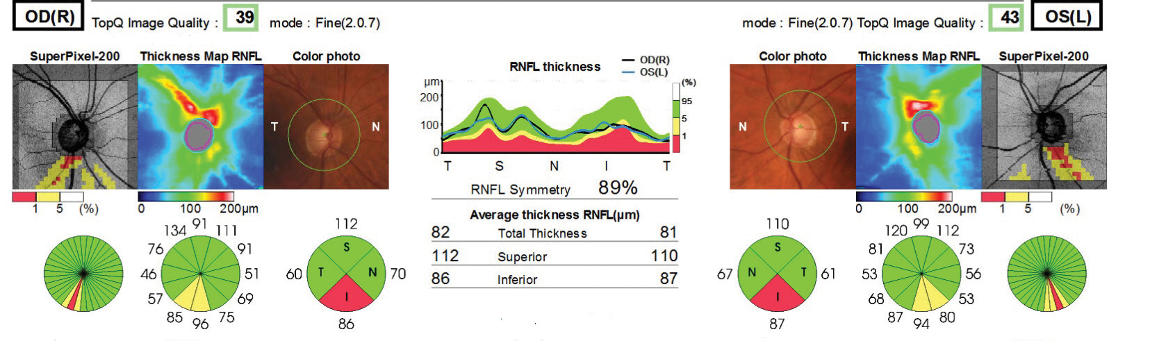 Figure 1. OCT of a patient with POAG Ib OU before mCPC. OU signs of GON: thinning of peripapillary fibers in the lower sector.