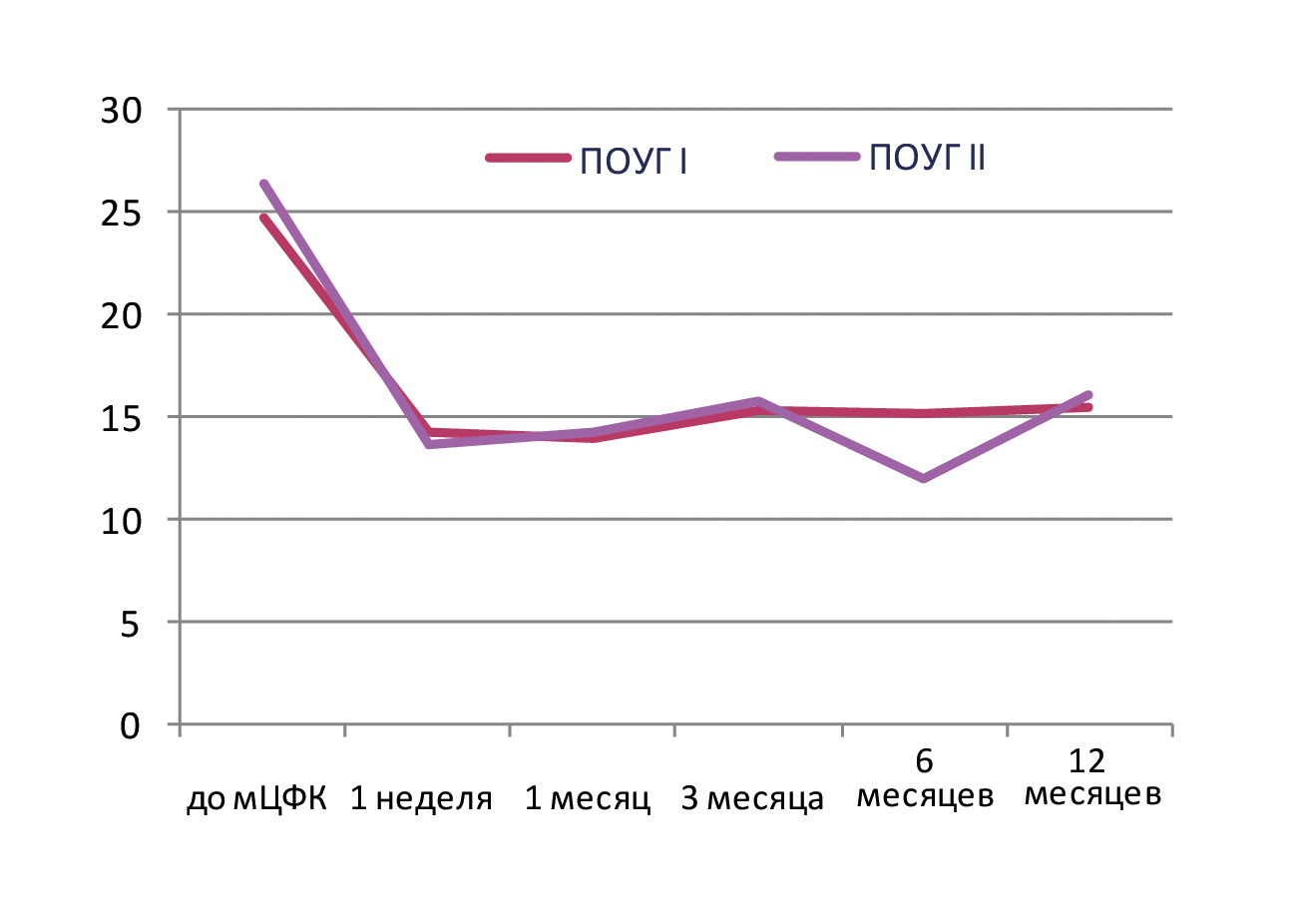 После проведения процедуры осложнений выявлено не было. Через 1 месяц после мЦФК уровень ВГД составил в среднем 15,0±5,0 мм рт. ст. в группе с начальной стадией и 14,2±6,2 в группе с развитой стадией. Гипотензивный эффект составил в среднем 36,9% и 44,7 % от исходного ВГД соответственно. Через 3 месяца наблюдения гипотензивный эффект сохранялся и составил в группах в среднем 15,8±4,2 и 15,5±4,5 мм рт. ст. соответственно. Гипотензивный эффект составил 34,8% и 38,3% от исходного значения ВГД. К 6 месяцам у наблюдаемых 22 пациентов уровень ВГД оставался стабильным и составил в среднем 15,5±4,5 мм рт. ст. У 14 пациентов за 12 месяцев наблюдения сохранялся гипотензивный эффект до 31% снижения от исходного ВГД, что составило в среднем 16,0±3,5 мм рт. ст. (рисунок 3).