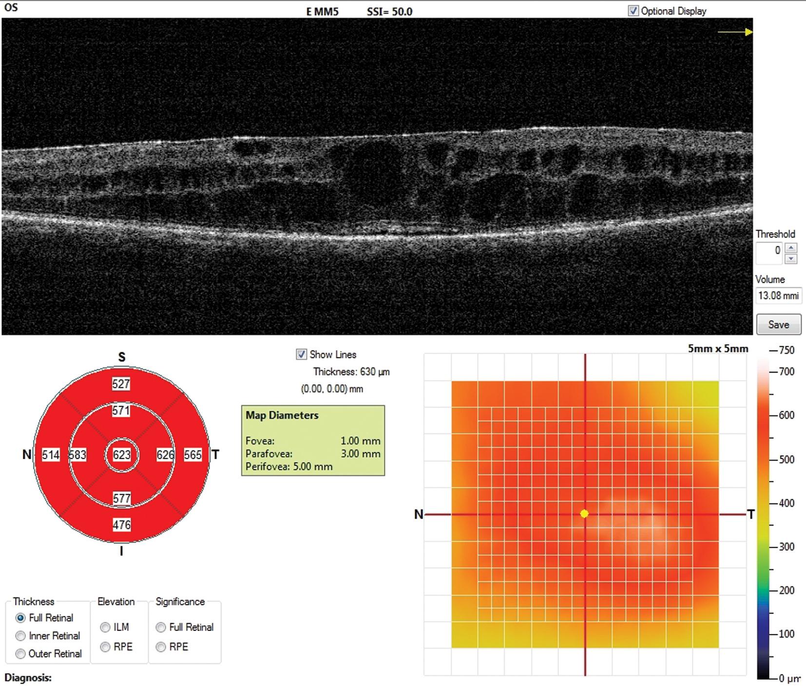 Пациентке было проведено стандартное офтальмологическое обследование, которое включало в себя проверку остроты зрения, биомикроскопию, офтальмоскопию с применением высокодиоптрийных линз, тонометрию, ультразвуковое исследование заднего отрезка глаза и оптическую когерентную томографию (ОКТ) макулярной области сетчатки. Максимальная корригированная острота зрения левого глаза составляла 0,3, роговица прозрачная, передняя камера средней глубины, радужная оболочка и хрусталик не изменены. Уровень внутриглазного давления пациентки оставался в пределах допустимых значений и составлял 12 мм рт. ст. при поступлении в стационар, 16 мм рт. ст. на следующий день после инъекции и 15 мм рт. ст. через 2 дня после инъекции. По данным ОКТ было выявлено наличие макулярного отека и эпиретинальной мембраны в макулярной области (рисунок 1).