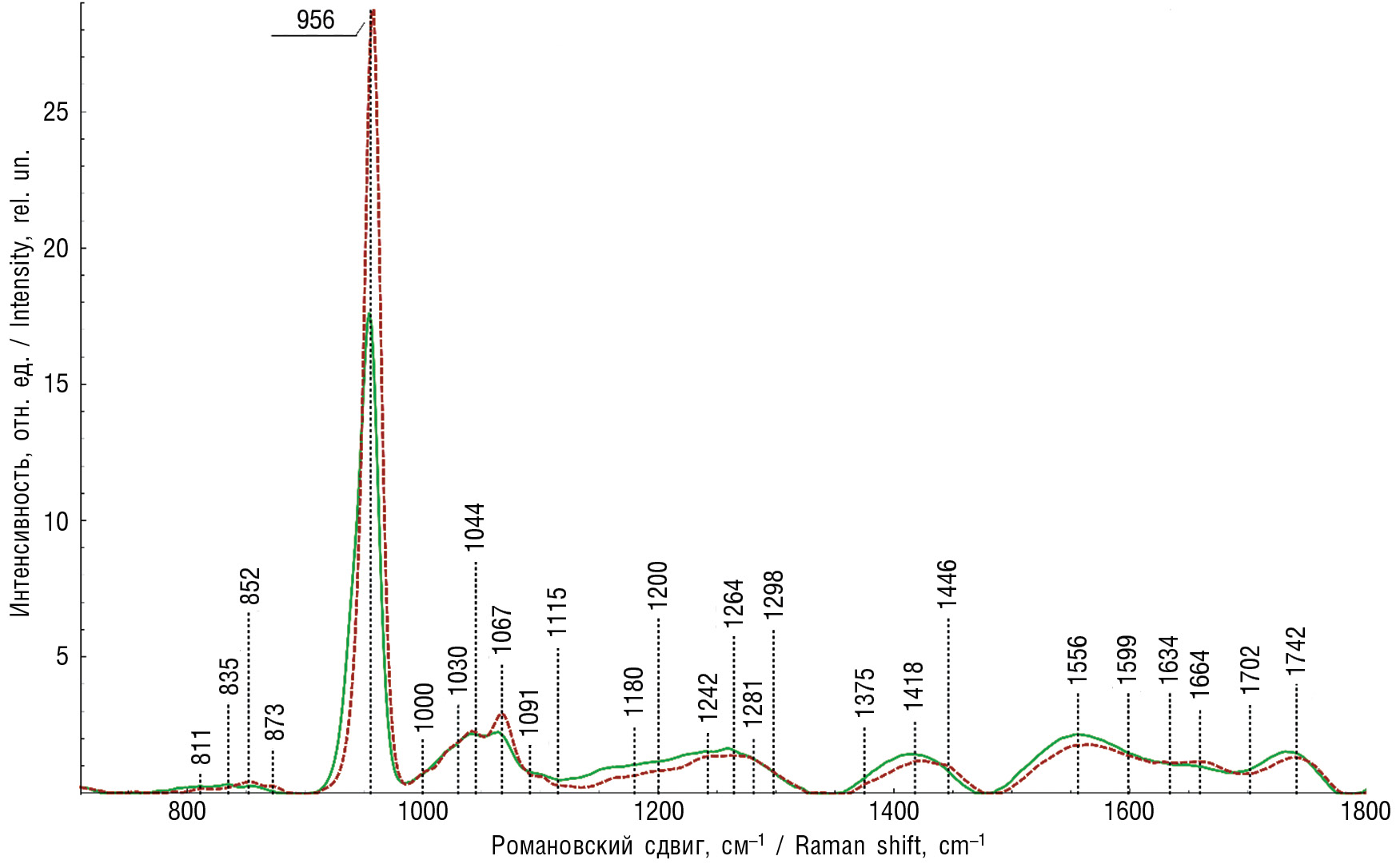 Анализ спектров здоровых тканей зубов и тканей зубов при пародонтите показывает, что основные спектральные различия тканей зубов при пародонтите проявляются в изменении амплитуды интенсивности линий органической составляющей 852, 873 см–1 [C-C stretching, prolineandhydroxyproline (collagenassignment)], 1664 (Amide I), 1242 (Amide III) и 1446 см–1 (Lipidsandproteins), а также в изменении амплитуды интенсивности линии минеральной составляющей зуба 956 см–1 [Р-О симметричное валентное РО43– (ν1)], 1067 [С-О плоскостное валентное СO32– (ν1) замещение B-типа] и 1091 см–1 [С-О плоскостное валентное СO32– (ν1) замещение А-типа].