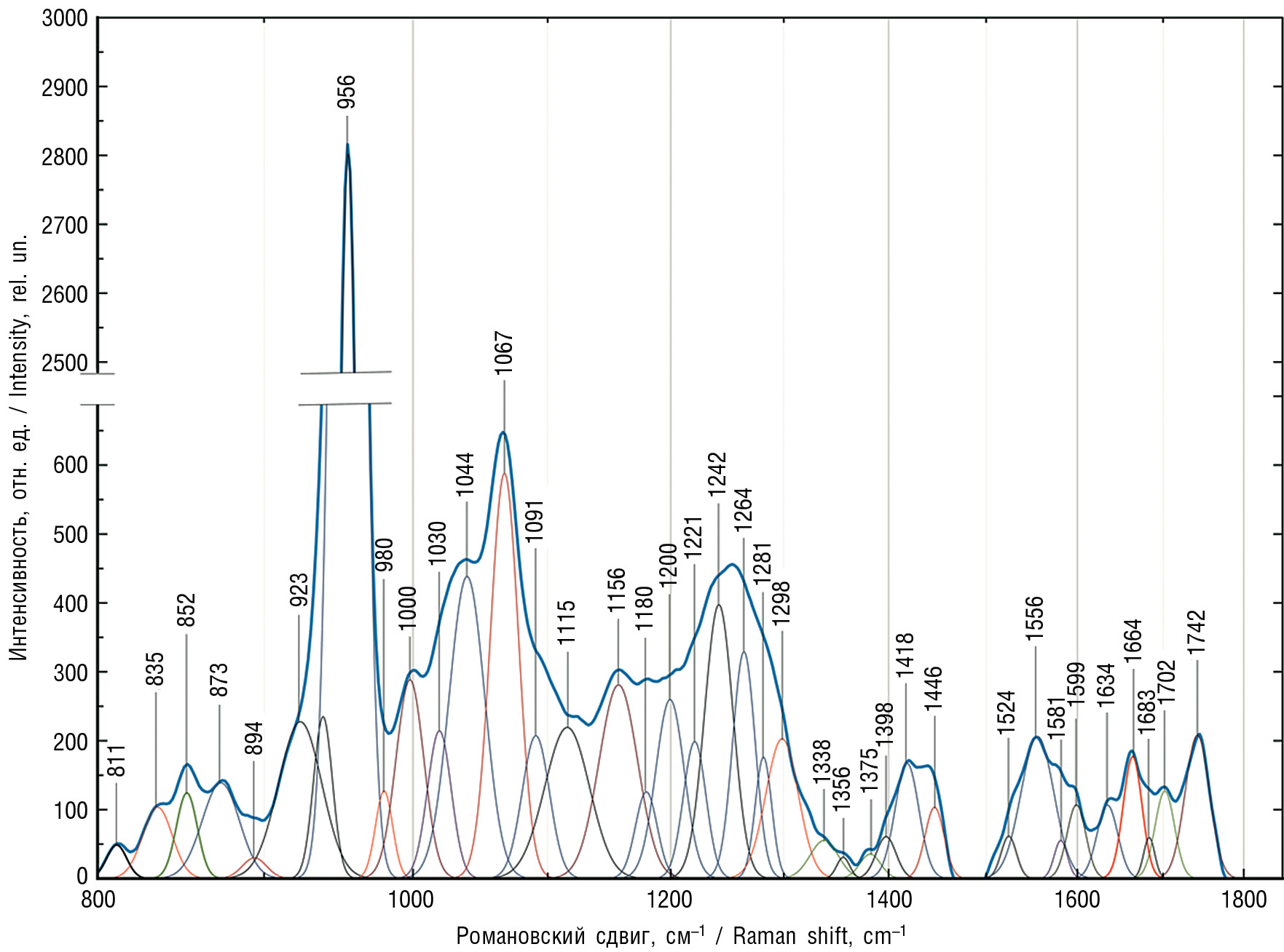 Для повышения информативности полученных спектров КР был произведен нелинейный регрессионный анализ спектров, состоящий в их разложении на спектральные линии. На рис. 2 представлен результат разложения спектрального контура на сумму распределений линий Гаусса.