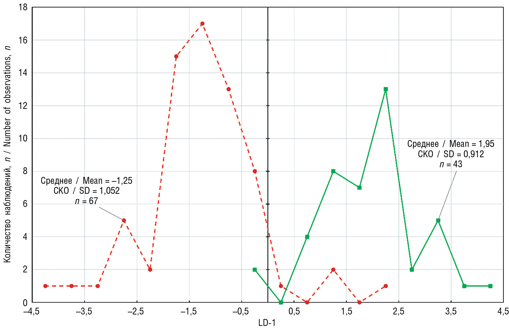 На рис. 3 представлены результаты LDA сравнения здоровой эмали и эмали зубов с пародонтитом. Проанализированы 67 спектров эмали зубов с пародонтитом и 43 спектра КР здоровой эмали зубов. Дискриминантная функция LD-1 описывает дисперсию на 100 %. Положительные значения LD-1 характерны для спектров КР, полученных для образцов здоровой эмали (среднее значение LD-1 группы равно 1,95, стандартное отклонение равно 0,912), и наоборот, отрицательные — группы образцов эмали с патологией (среднее значение LD-1 группы равно –1,25, СКО равно 1,052). Области групп имеют незначительное пересечение в интервале LD-1 = {–0,25; 2,25}.