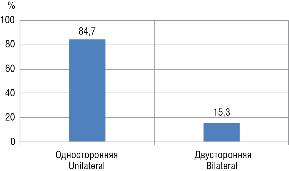 При ретроспективном анализе 423 историй болезни у 72 пациентов (17,02 %) была обнаружена ретенция 104 зубов. В свою очередь, односторонняя ретенция зубов была обнаружена у 61 пациента, двусторонняя — у 11 пациентов (рис. 1).