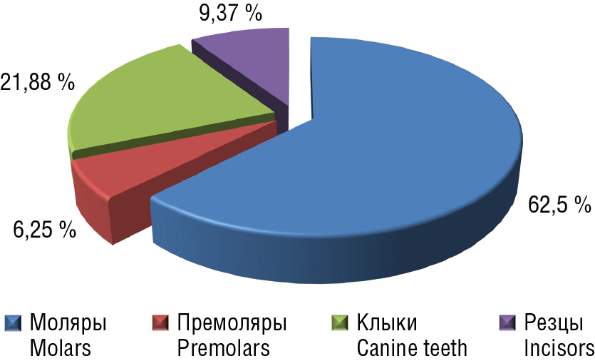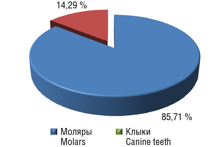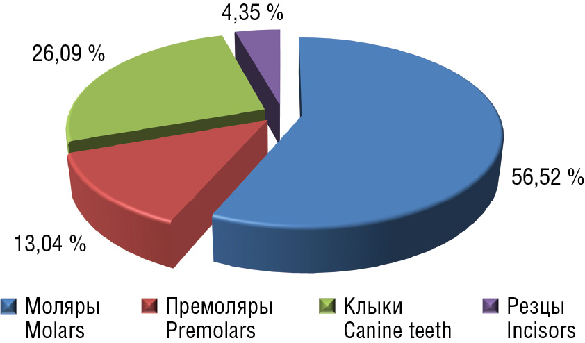Проведено клиническое обследование 134 ортодонтических пациентов в возрасте 18–36 лет, у 15 пациентов (11,19 %) обнаружена ретенция 23 зубов. В превалирующем большинстве ретенированными зубами являлись моляры (рис. 4, 5).