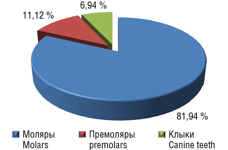 По данным ретроспективного анализа данных пациентов, обратившихся за ортодонтической помощью на клинические базы кафедры стоматологии детского возраста и кафедры стоматологии ИПО Самарского государственного медицинского университета в период 2017–2020 гг., было выявлено, что ретенция зубов встречается в 17,02 % случаев. По данным клинического обследования 134 ортодонтических пациентов в возрасте 18–36 лет, у 11,19 % пациентов обнаружилась ретенция зубов. В превалирующем большинстве ретенированными зубами являлись моляры верхней и нижней челюсти, вторыми по частоте ретенции — клыки верхней челюсти.
