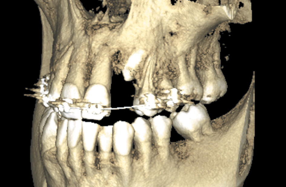 Единственным методом диагностики, позволяющим поставить диагноз ретенции зубов, считается рентгенологический. Все пациенты с задержкой прорезывания зубов были направлены на проведение конусно-лучевой компьютерной томографии. У одного пациента ретенция верхнечелюстного клыка сочеталась с адентией латерального резца (рис. 6).