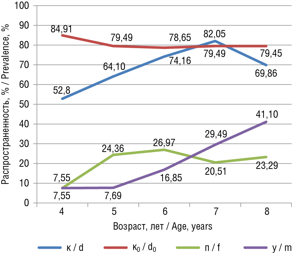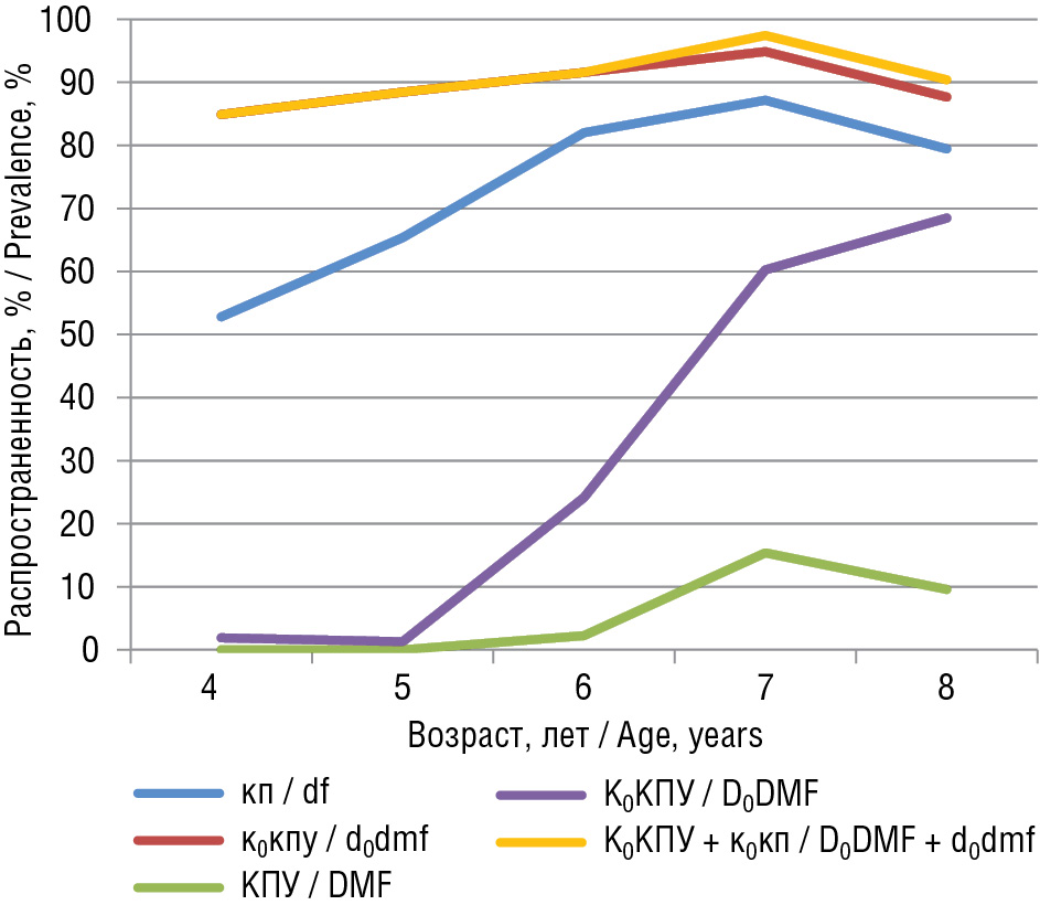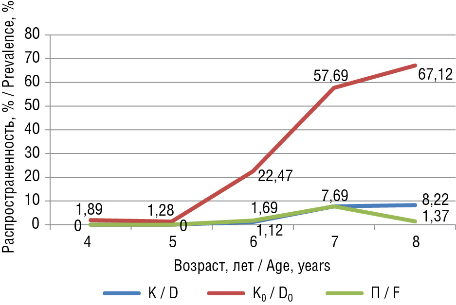 На диаграмме видно, что динамика распространенности кариеса, подсчитанная с использованием критериев индекса К0КПУ для постоянного прикуса, отличается от динамики по остальным индексам, демонстрируя существенный прирост распространенности кариеса молодых постоянных зубов от 1,28 до 68,49 % уже к 8-летнему возрасту. Остальные индексы показывают схожую между собой динамику, в том числе редукцию распространенности кариеса в возрастном периоде 7–8 лет, которая объясняется продолжающейся физиологической сменой в одном случае и нечувствительностью индекса КПУ для бесполостных форм кариеса — в другом. Существенная разница в распространенности кариеса для индексов КПУ и К0КПУ говорит о нечувствительности индекса КПУ для данных возрастных групп и о необходимости срочного профилактического вмешательства.