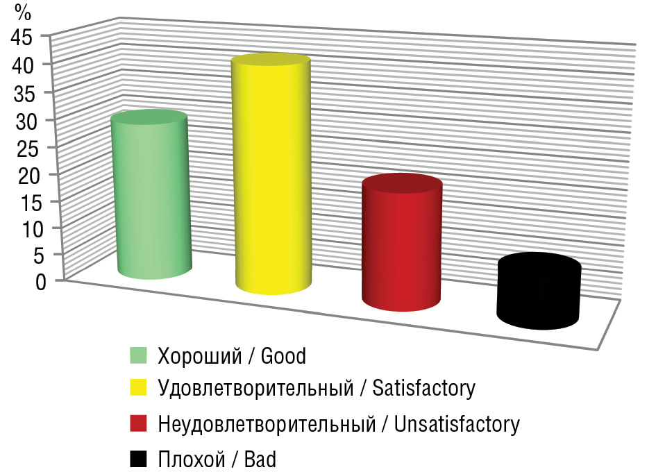 Было установлено, что среди пациентов с брекет-системами удовлетворительный уровень гигиены полости рта наблюдался у 41 % пациентов (49 человек: 32 девушки/женщины и 17 юношей/мужчин); хороший уровень — у 29 % (35 человек: 22 девушки/женщины и 13 юношей/мужчин), неудовлетворительный — у 21 % (25 человек: 17 девушек/женщин и 8 юношей/мужчин) и плохое качество гигиены было у 9 % (11 человек: 7 девушек/женщин и 4 юноши/мужчины) из числа обследованных (рис. 2).