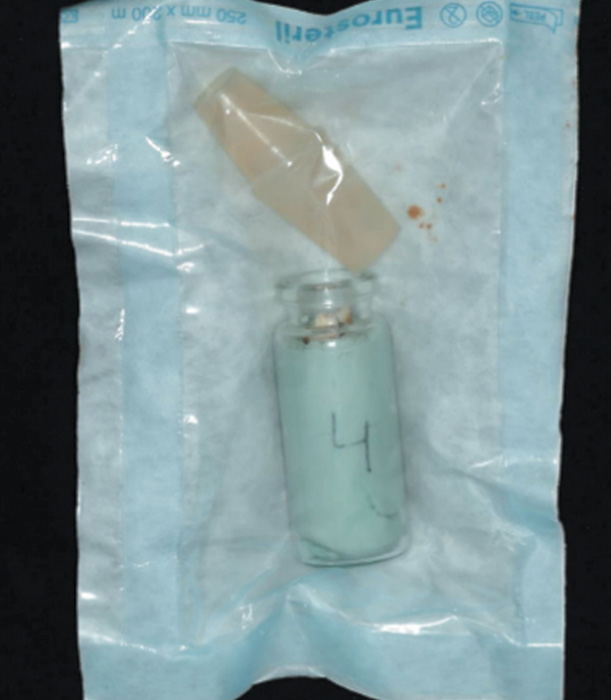 1-й этап. Подготовка подложки для микроорганизмов, в качестве которой выступают удаленные человеческие зубы, оттискная масса и пробирка с силиконовой крышкой. Для этого корневые каналы удаленных зубов инструментально расширяют до 80-го размера по ISO для облегчения вхождения инструментов и растворов в ходе дальнейших манипуляций. На внешнюю поверхность корня зуба также наносят насечки, имитирующие нарушение целостности цемента во время прогрессирования пародонтита и периодонтита. Подготовленные зубы помещают в стеклянную пробирку с С-силиконом (рис. 1–3), при этом между корнем зуба и оттискной массой создается пространство для имитации пародонтального кармана. Далее образцы с силиконовой крышкой помещают в крафт-пакеты, после чего стерилизуют в автоклаве при температуре 132 °С, 2,2 атм., в течение 20 мин (рис. 4, 5). Стерильность изготовленной подложки была проверена и подтверждена. Для проведения эксперимента нами было подготовленно 30 подложек по вышеописанной методике.
