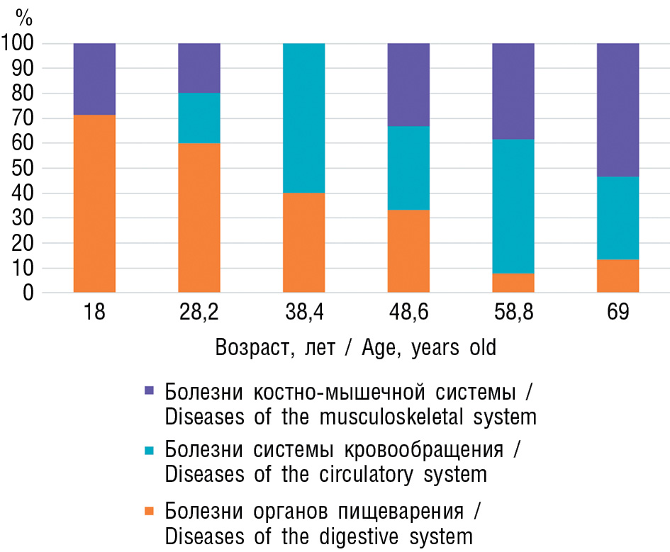 Коморбидная соматическая патология выявлена у 59,6 % обследованных. Признаки одного заболевания регистрировались в 29,4 % случаев, двух — в 31,2 % случаев, сочетание трех и более соматических заболеваний регистрировались в 23,9 % случаев. Выявлено превалирование болезней органов пищеварения (29,9 %), из которых (81,5 % случаев) хронический гастрит, хронический колит, язвенная болезнь желудка и двенадцатиперстной кишки диагностировались наиболее часто; на втором месте — болезни системы кровообращения (24,5 %) с превалированием (до 55,1 % случаев) гипертонической болезни; и наконец, третье место (17,1 %) занимали болезни костно-мышечной системы, из них остеохондрозы в 66,5 % случаев (см. рисунок).