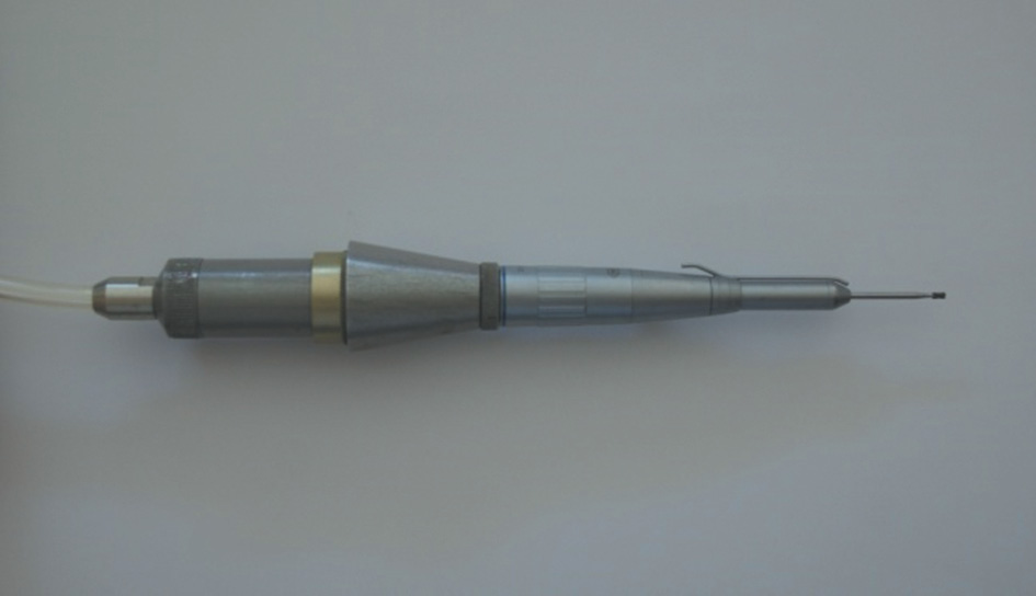 Турбинное отделение соединено со специальным устройством для фиксации наконечника. Сверло или другой инструмент (бор, пила) надевается в зависимости от цели, которую преследует хирург. В том случае, когда необходимо, использовать сверло для подготовки отверстий, применяется обычный наконечник, который жестко соединяется с турбинной бормашиной. Приводится в движение нажатием на ножную педаль. Когда при сверлении возникает сопротивление, включается следующая ступень и машинка не останавливается, а продолжает работать. Это происходит вследствие автоматического включения следующих ступеней (2-я или 3-я). Сверление мы осуществляем стандартными сверлами. Если необходимо использовать пилу Линдемана, надевается специальный наконечник. Плоскостная остеотомия производится с помощью реципрокной пилы, производящей не вращательное, а поступательное движение.