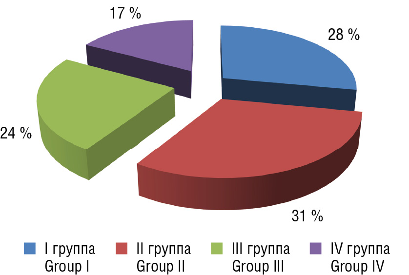 I группа (n = 16) | II группа (n = 18) | III группа (n = 14) | IV группа (n = 10) | |