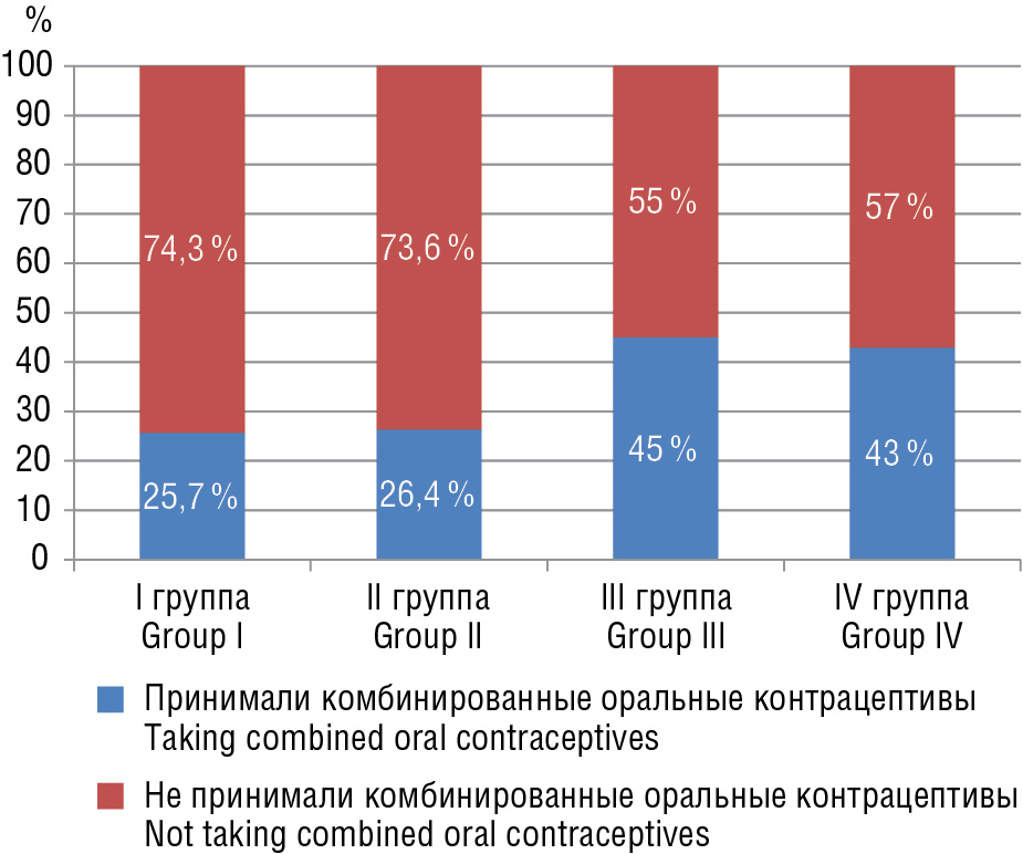 Пациентки из контрольных групп чаще использовали оральные контрацептивы (КОК), чем пациентки из основных групп (р < 0,05) (рис. 2).