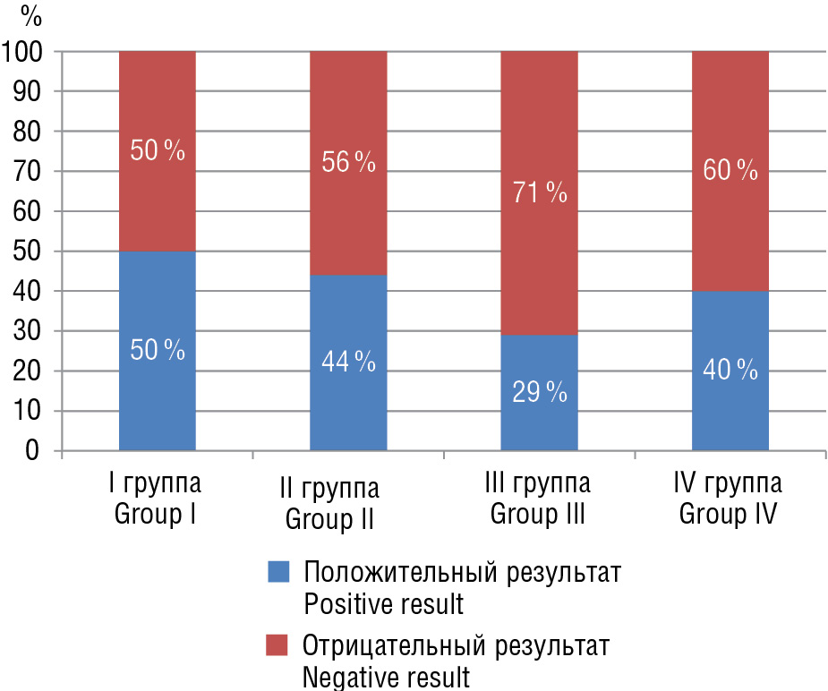 Положительный результат на наличие ВПЧ высокого канцерогенного риска чаще имели пациентки из I, II, IV групп, чем пациентки из III группы (р < 0,05) (рис. 3).