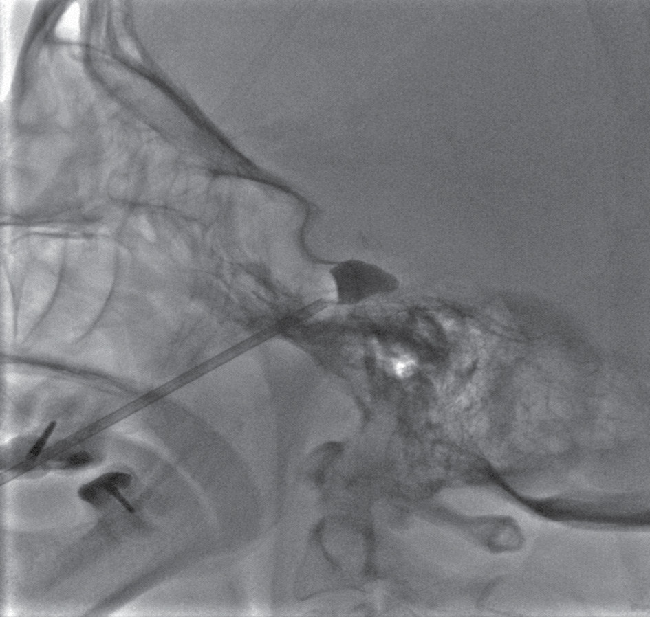 Суть хирургического лечения заключается в компрессии гассерового узла путем пункции овального отверстия через подвисочную ямку с помощью набора Муллона, баллоном-катетером, в котором временно создается давление. Выполняют переднелатеральный доступ, при котором пункционную иглу длиной 8–10 см вводят примерно на 3 см латеральнее угла рта на уровне верхнего второго моляра; иглу направляют медиально, вверх и дорсально. Кончик иглы ориентируют на зрачок (если смотреть спереди) и середину скуловой дуги (если смотреть сбоку). Игла должна пройти кнаружи от полости рта между ветвью нижней челюсти и верхней челюстью, затем латеральнее крыловидного отростка, и проникнуть в полость черепа, в среднюю черепную ямку через овальное отверстие. Контроль положения иглы осуществлялся с помощью электронно-оптического преобразователя, введение иглы проводили до уровня верхней границы спинки турецкого седла (рис. 1). Через иглу до уровня тройничного вдавления пирамиды височной кости, в меккелеву полость, проводят баллон-катетер. Баллон раздувается смесью контраста с физиологическим раствором (не более 1 мл) и приобретает при этом чаще грушевидную форму. Экспозиция компрессии длится 10 мин, после чего иглу и сдутый баллон одномоментно удаляют. Выполняют гемостаз с давлением на место пункции — на 1–2 мин, после чего накладывают асептическую наклейку.