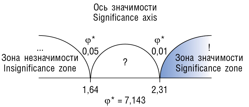 Рис. 2. Критерий Фишера для результатов лечения. Полученное эмпирическое значение ϕ* находится в зоне значимости