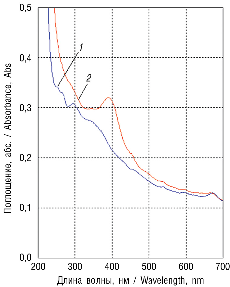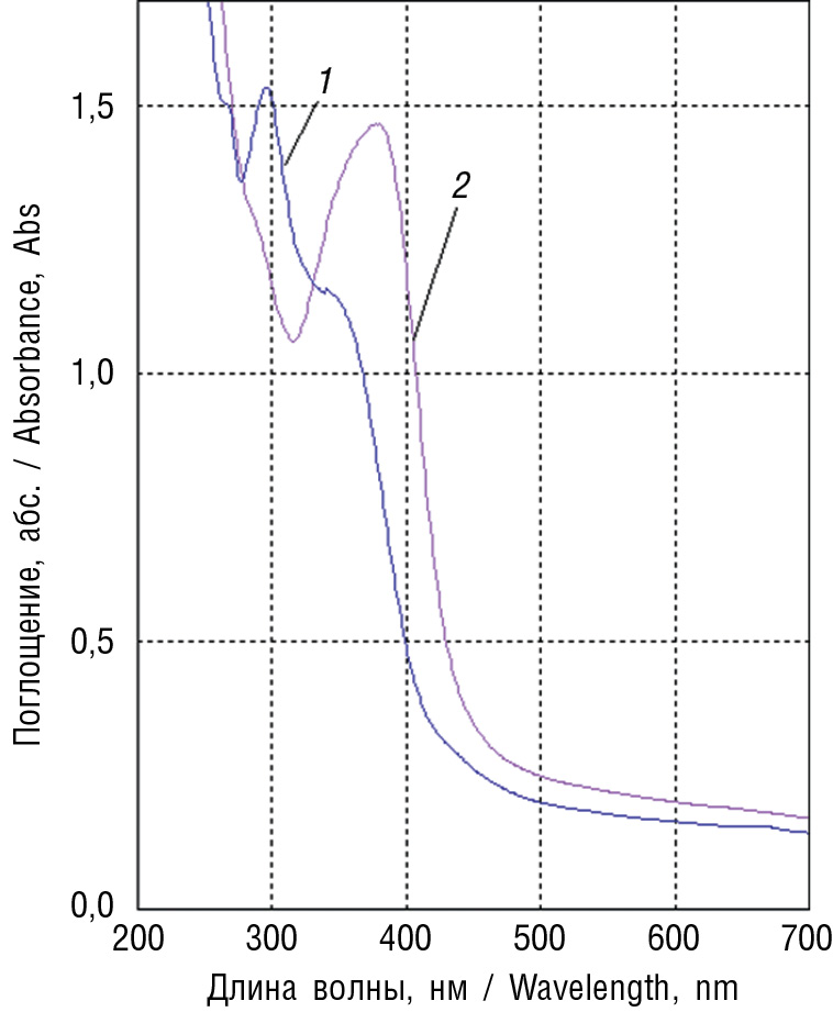 Рис. 1. Электронные спектры исходного раствора (1) и щелочно-аммиачного раствора (2) водно-спиртового извлечения из листьев алоэ вера