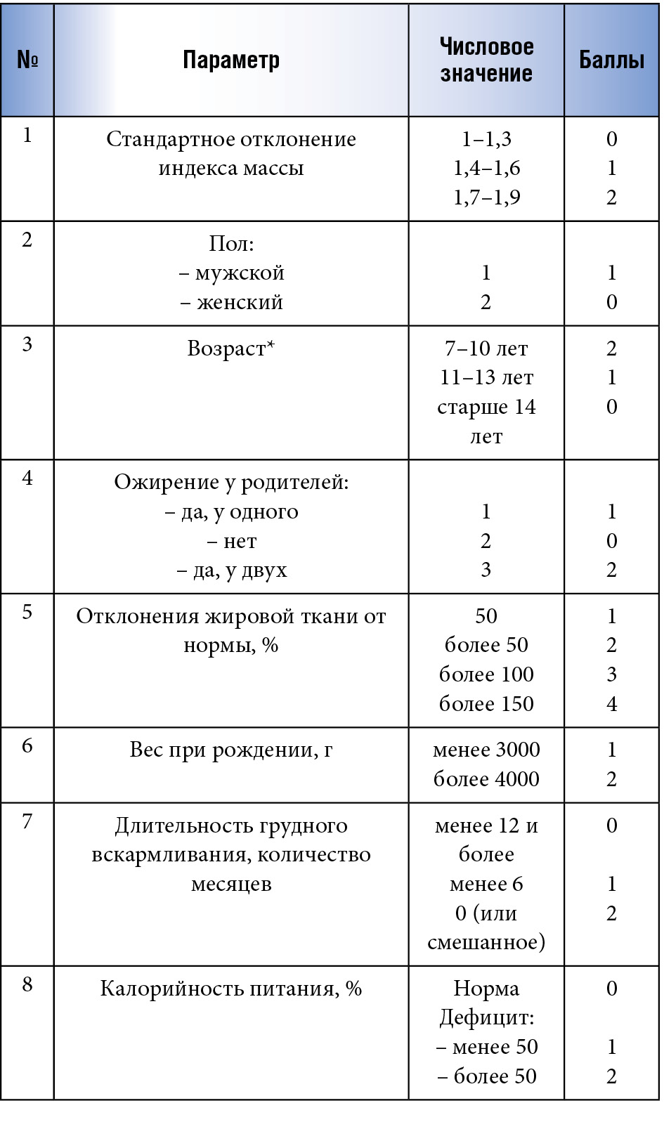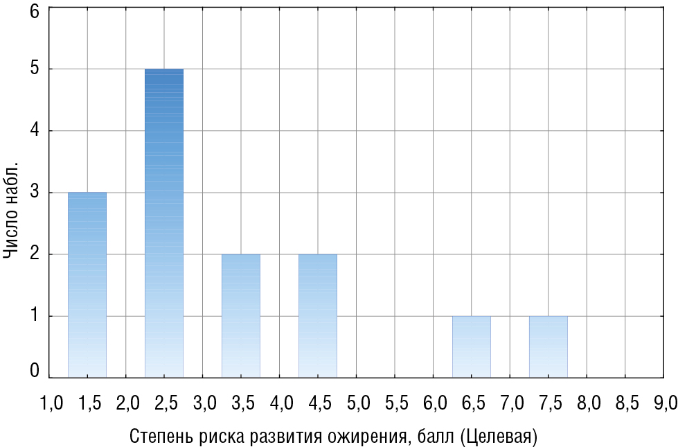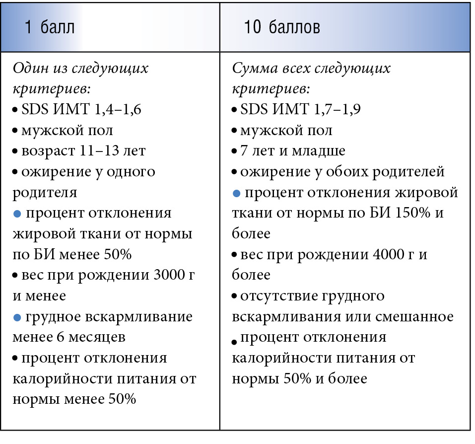Выходной параметр принимал значения от 7 до 10 баллов – если риск развития ожирения у детей высокий, 4–6 баллов – риск умеренный, до 4 баллов – минимальный. В таблице 2 приведена сравнительная характеристика критериев в зависимости от присвоенных баллов.