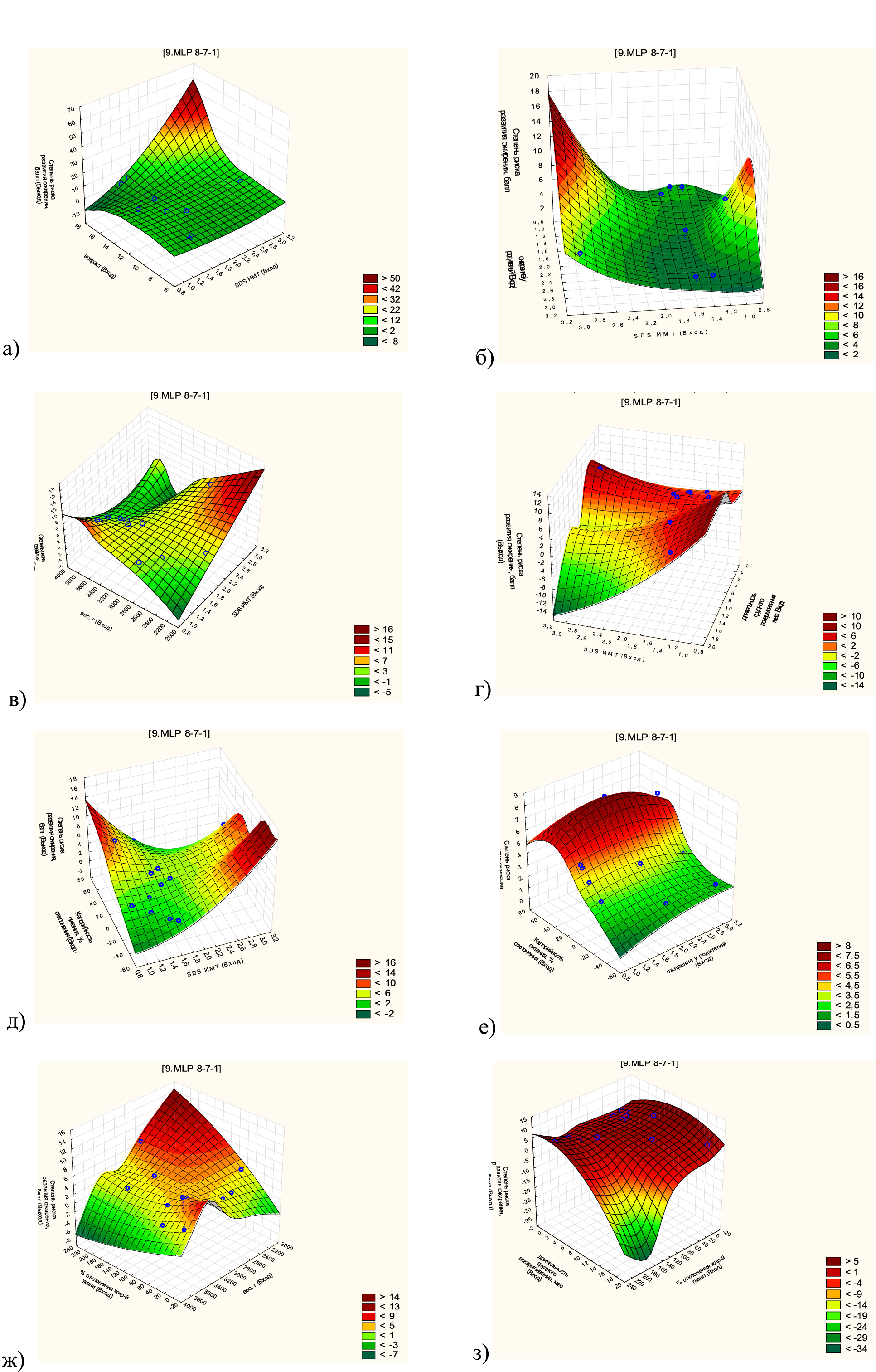 Рисунок 2. Поверхность отклика степени риска развития ожирения от попарного влияния факторов: а) SDS ИМТ и возраст, лет; б) SDS ИМТ и ожирение у родителей; в) SDS ИМТ и вес при рождении, г; г) SDS ИМТ и длительность грудного вскармливания, мес.; д) SDS ИМТ и калорийность питания, % отклонения; е) ожирение у родителей и калорийность питания, % отклонения; ж) % отклонения жировой ткани и вес, г; з)% отклонения жировой ткани и длительность грудного вскармливания, мес.