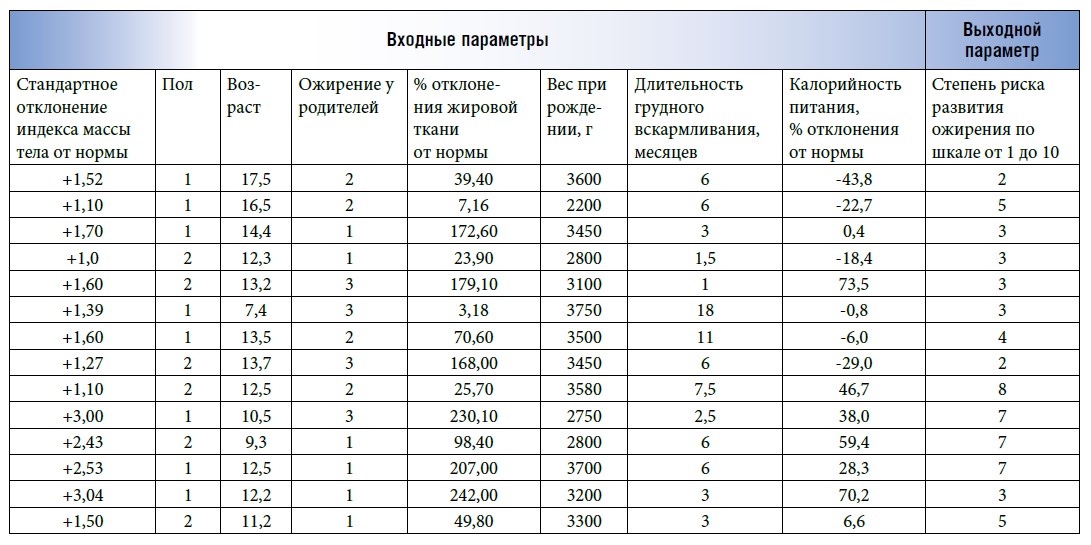 В качестве входных параметров использовали показатели, которые отражают наиболее значимые факторы риска развития ожирения у детей.