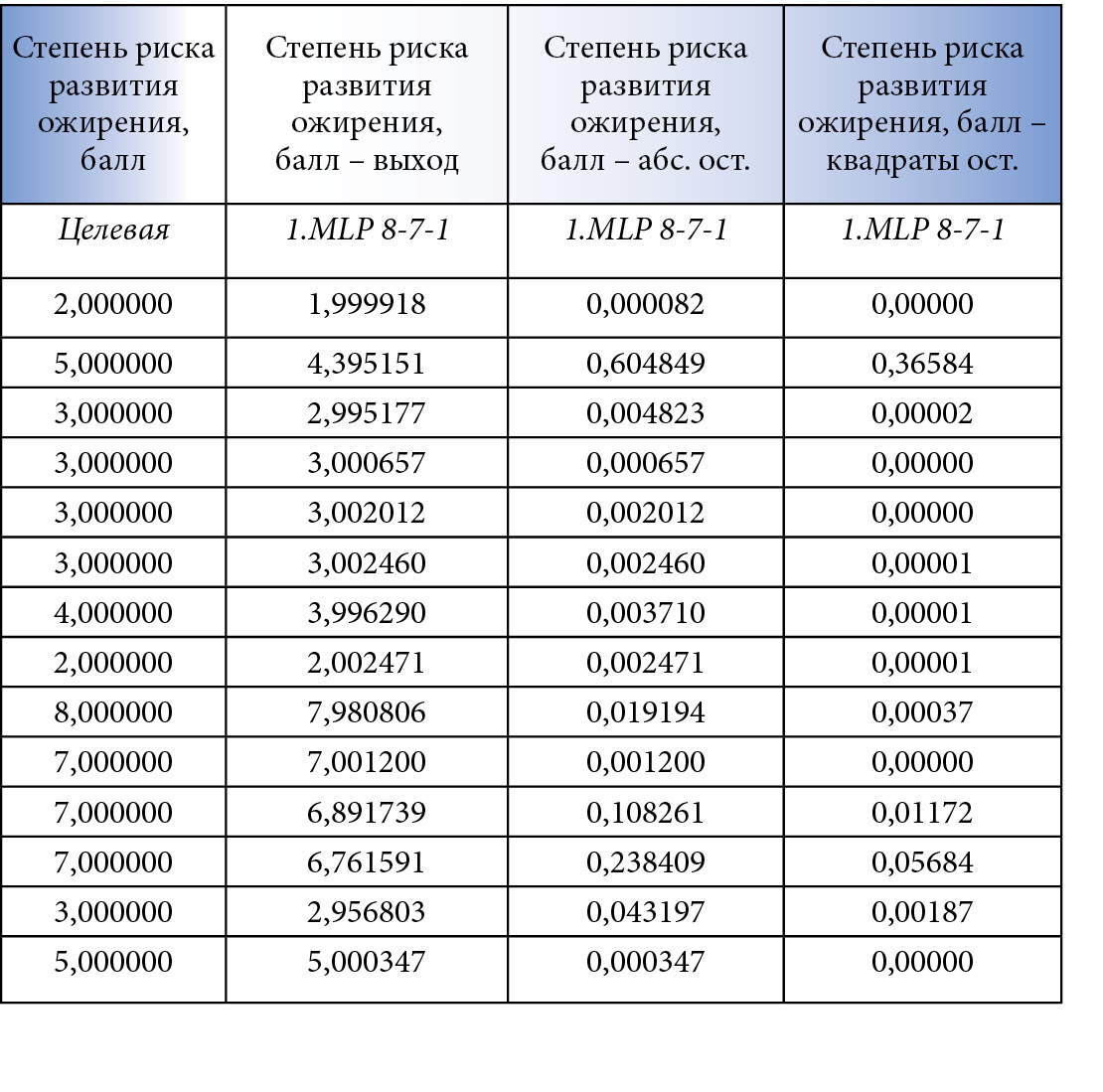 В таблице 4 в первом столбце представлены оценки степени риска развития ожирения, полученные в ходе обследования врачом-эндокринологом, во втором – предсказанные нейронной сетью MLP 8-7-1 значения выходного параметра. При сравнении этих данных рассчитаны значения абсолютного отклонения, которые по всей выборке не превышали 0,604849 (третий столбец). Также получены значения относительного отклонения. Сумма квадратов остатков (остаточная сумма квадратов) минимальна и колебалась в диапазоне от 0 до 0,36584. Вероятность точного прогнозирования – 99,8%.