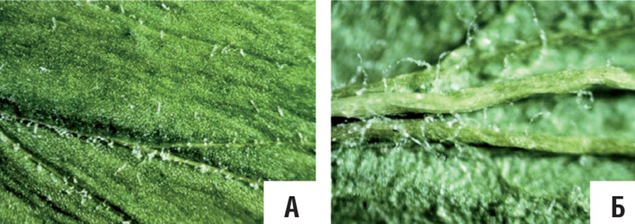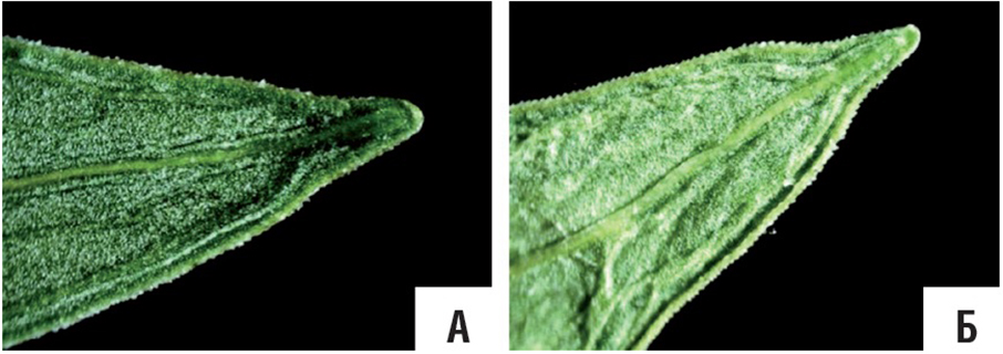 В зависимости от топографии листьев на стебле было установлено, что верхние листья практически лишены трихом (рисунок 2 А, Б). На средних и нижних стеблевых листьях отчетливо заметны многочисленные простые трихомы, располагающиеся как по жилкам, так и по поверхности листовой пластины. На нижней стороне листа трихомы более многочисленные (особенно у основания листа) и длинные, клетки тонкие и перекрученные.