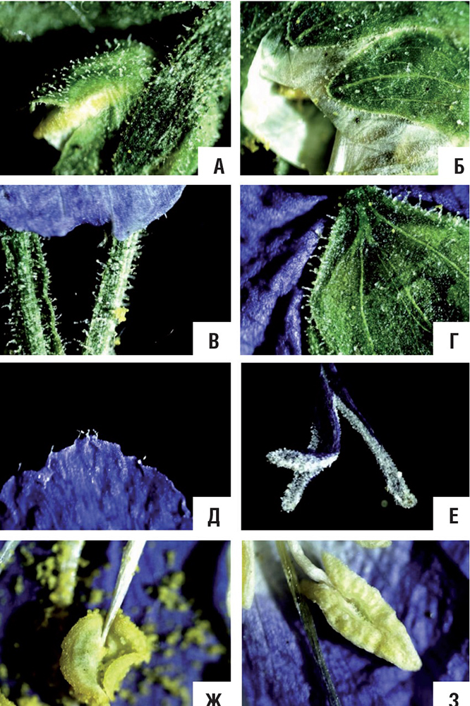 При рассмотрении цветка (рисунок 3 А–З) были визуализированы многочисленные простые трихомы на листочках чашечки, а также железистые с длинной многоклеточной ножкой и выделительной головкой желтоватого цвета, в большинстве своем локализованные по краям листочка. Наиболее опушены бутоны. Лепестки венчика нераскрывшегося цветка беловатого цвета. Лепестки венчика раскрывшегося цветка синего цвета, по краям лепестка наблюдаются многоклеточные простые трихомы с тонкими клеточными стенками. Отчетливо видна трубка пестика, сильно опушенная по внутренней части беловатыми трихомами. Пыльники крупные, удлиненные, желтоватого цвета.