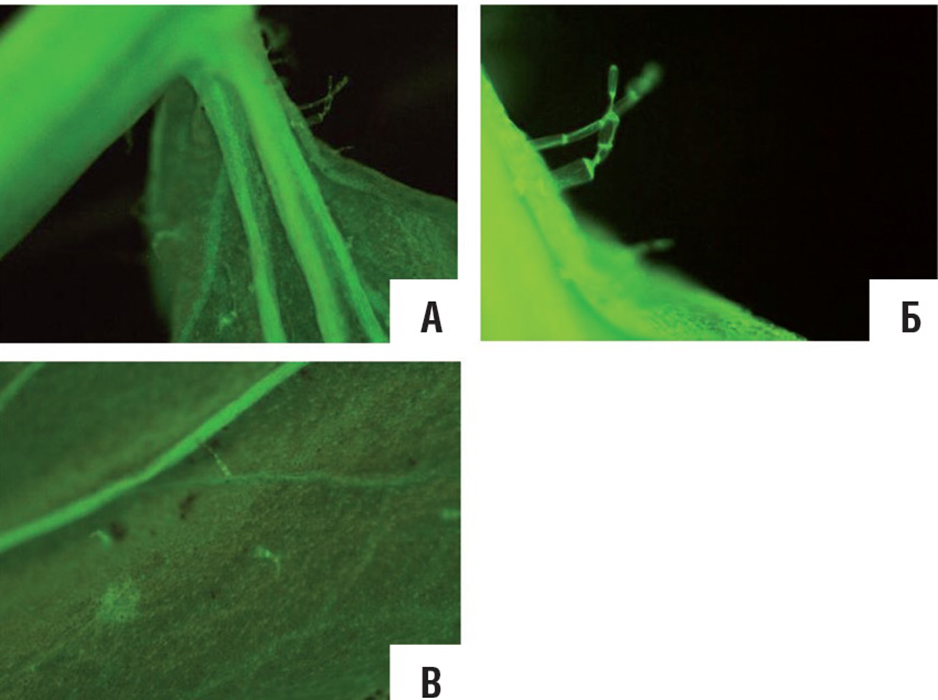 Рисунок 4. Характер автолюминесценции тканей листа синюхи голубой: А – простые многоклеточные волоски у основания листа, ув. х40, Б – ув. х100, В – простые конические волоски на нижней поверхности листа, ув. х40