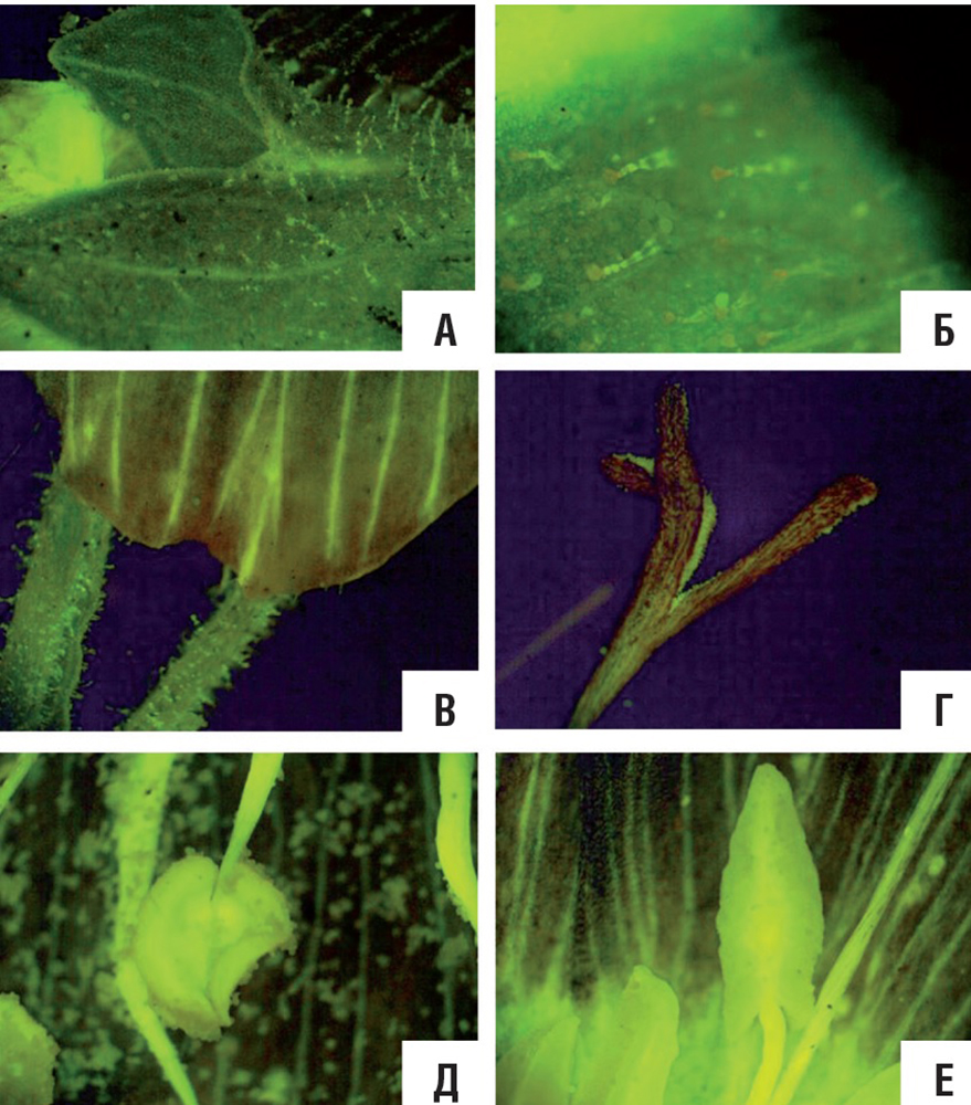 Рисунок 5. Характер автолюминесценции тканей цветка синюхи голубой: А – чашечка, ув. х40, Б – железистые волоски на чашечке, ув. х100, В – цветоносы и лепесток венчика, ув. х40, Г – пестик, ув. х100, Д, Е – пыльники и пыльца, ув. х100