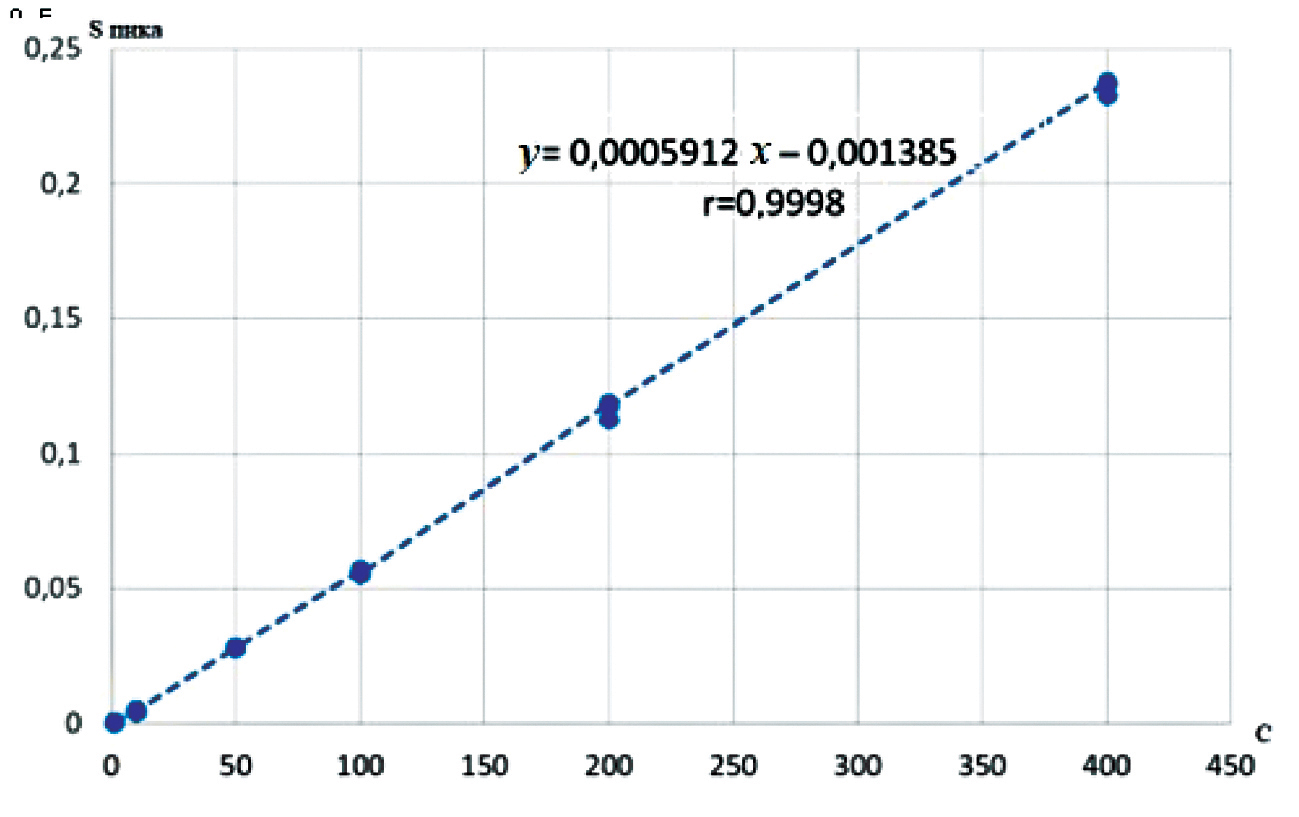 Методика количественного определения линейна в пределах 1−400 мкг/мл, что соответствует содержанию клопидогрела в пробе от 2 нг до 800 нг соответственно. На основании величин калибровочной прямой было рассчитано значение LOD и LOQ с использованием стандартного отклонения перехвата (Sa) в соответствии со следующими уравнениями [21]: