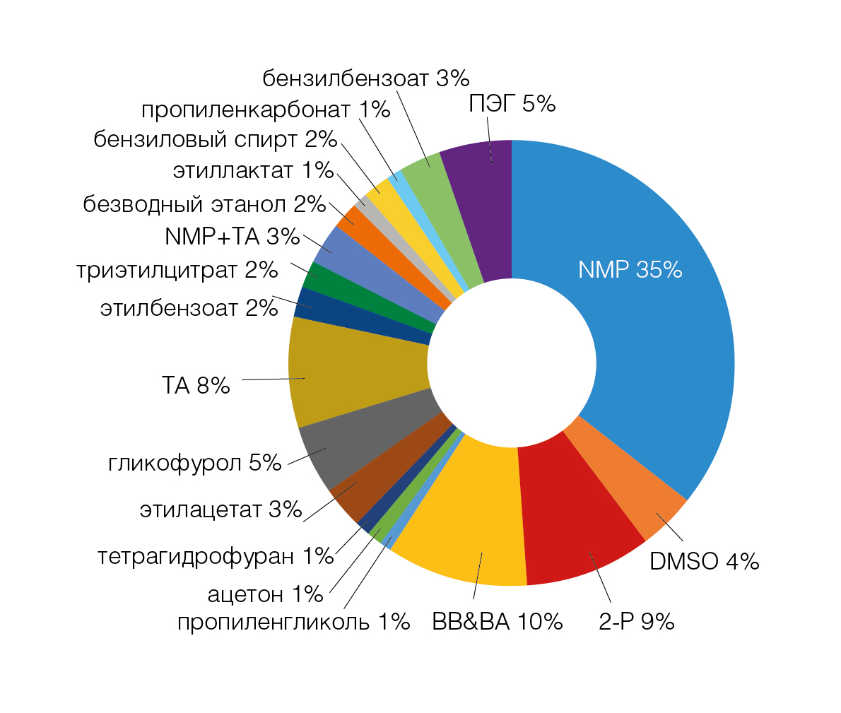 В формировании матрицы фазочувствительной in situ системы важную роль играет растворитель. Для сравнительной оценки популярности использования различных растворителей в разработке in situ имплантатов были проанализированы более 50 экспериментальных исследований. Согласно проведенному анализу публикаций, выполненному по базе научных медицинских публикаций PubMed, результаты которого представлены на рисунке 1, лидирующие позиции занимают растворители «золотого стандарта» N-метилпирролидон (N-methylpyrrolidone, NMP) и диметилсульфоксид (dimethyl sufoxide, DMSO), а также смесь бензилбензоата и бензилового спирта (benzyl benzoate and benzyl alcohol, BB&BA) и 2-пирролидон (2-pyrrolidone, 2-P). Реже в качестве растворителей используются ПЭГи различной молекулярной массы, триацетин (triacetin, ТА), гликофурол, сольные бензилбензоат и бензиловый спирт, этиллактат, пропиленкарбонат, триэтилцитрат и другие. Исследователями рассматриваются как монорастворители, так и комбинации, где самостоятельный растворитель может выполнять роль сорастворителя. Так, ТА и ПЭГи довольно часто выступают в роли сорастворителей в составах с NMP и DMSO.