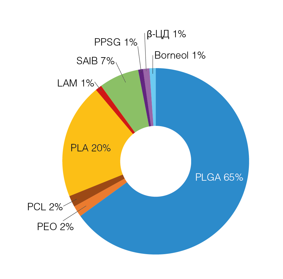 Обзор базы данных научных публикаций PubMed с 1994 по 2017 гг. показал, что наиболее востребованным в технологии in situ фазочувствительных систем является сополимер молочной и гликолевой кислот, называемый в литературе PLGA (полилактид-со-гликолид). После анализа различных статей был сделан вывод, что в сфере применения фазочувствительных полимеров в медицине как систем доставки лекарственных веществ на долю PLGA приходится примерно 65–66% разработок [5–28]. Вдвое меньшую долю применения имеет гомополимер молочной кислоты полилактид (PLA). Остальные системы доставки состоят из таких полимерных матриц, как плюроники, поликапролактон, метиловый эфир N-лауроил-l-аланина, изобутират ацетата сахарозы, борнеол и иные полимеры. Результаты анализа публикаций представлены на рисунке 2.
