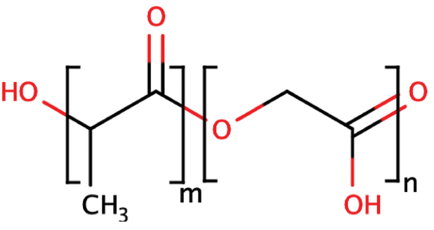 PLGA (рисунок 3) представляет собой линейный алифатический сополимер, полученный при блок-сополимеризации взятых в различных соотношениях составляющих его мономеров, молочной кислоты (LA) и гликолевой кислоты (GA). Он может быть синтезирован с любым соотношением LA и GA, а его молекулярная масса (Mw) находится в широком диапазоне от менее 10 000 до 200 000 Да.