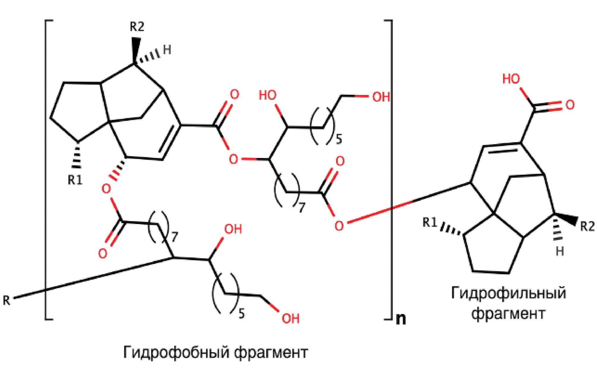 Шеллак представляет собой амфифильную биомакромолекулу с характерной молекулярной структурой, состоящую из эфиров алевритовой (C16H32O5) и шеллоновой (C15H20O5) жирных кислот (рисунок 4). Шеллак предложен к использованию в качестве матрицы фазочувствительных in situ систем в последних работах группы тайских исследователей [29].